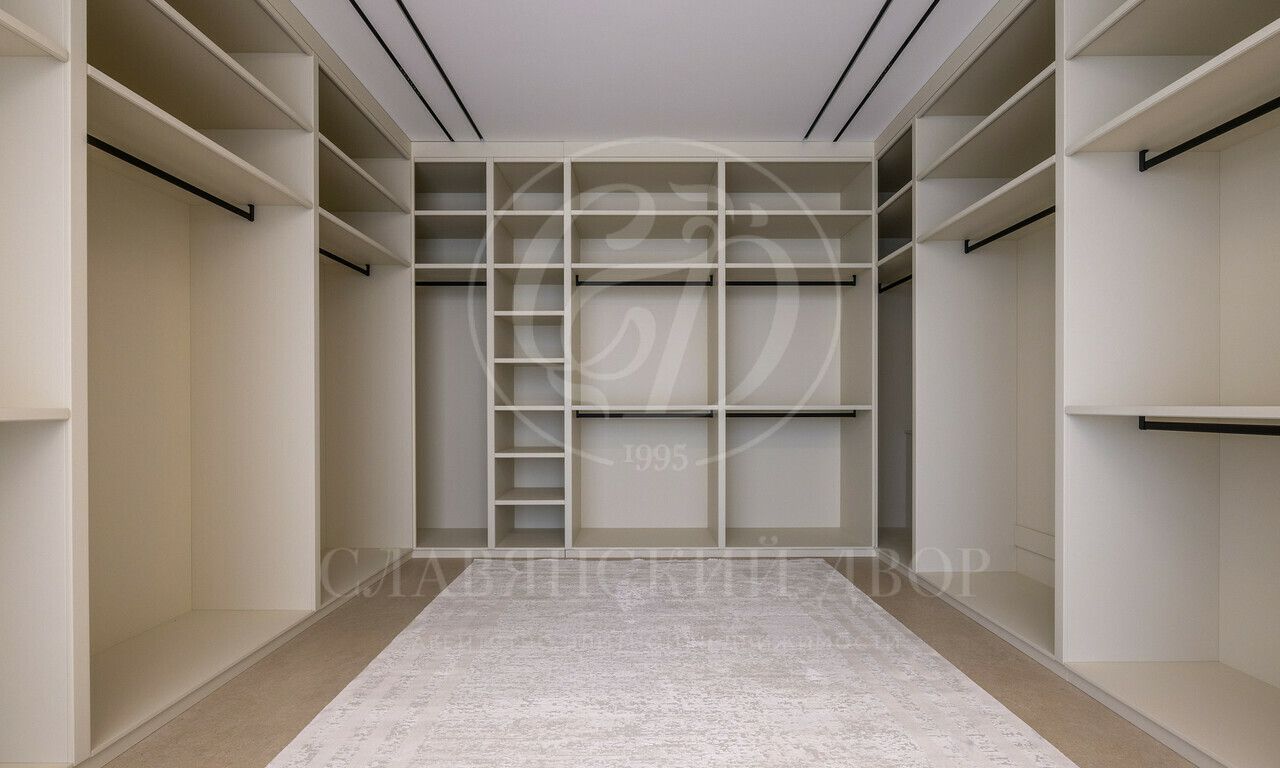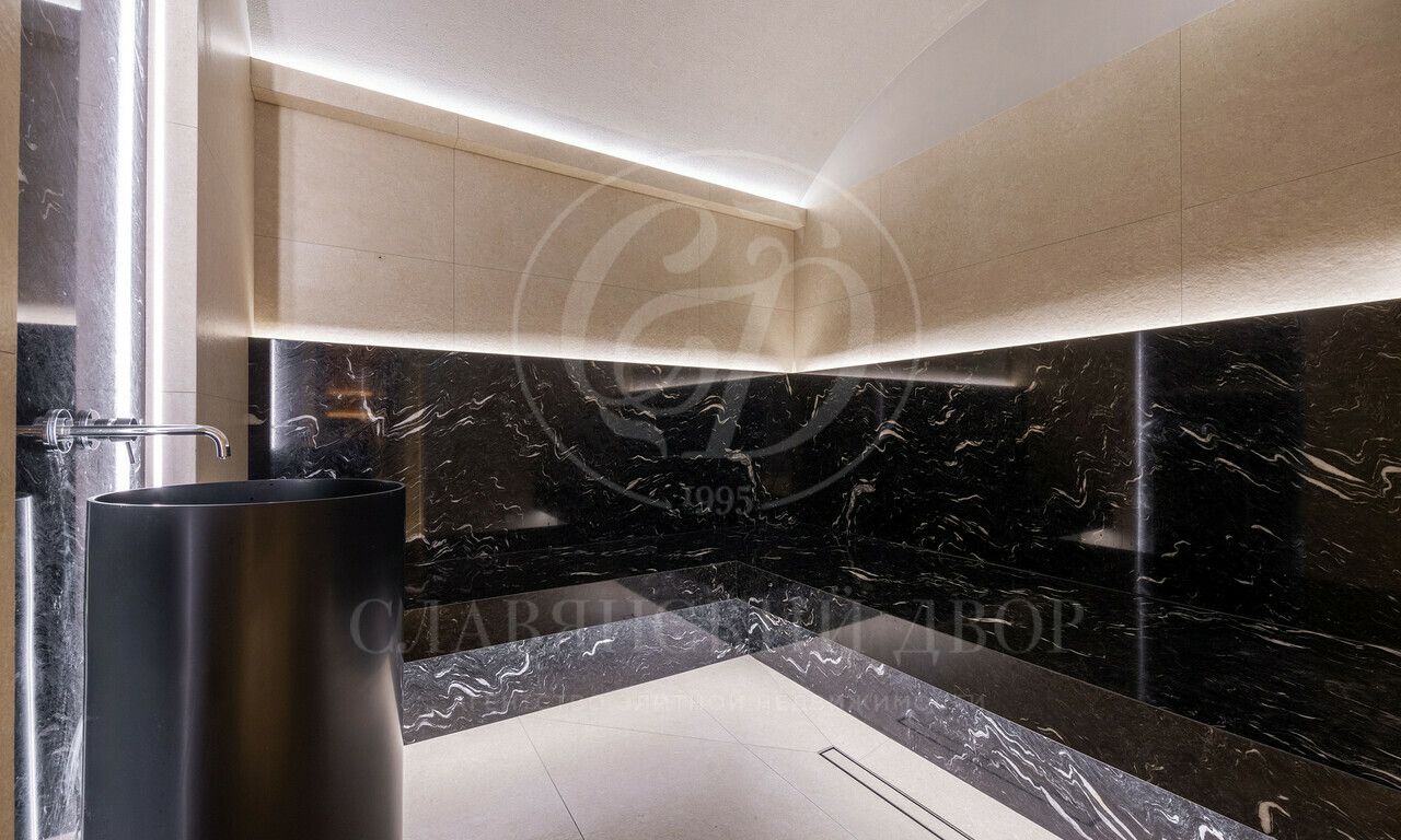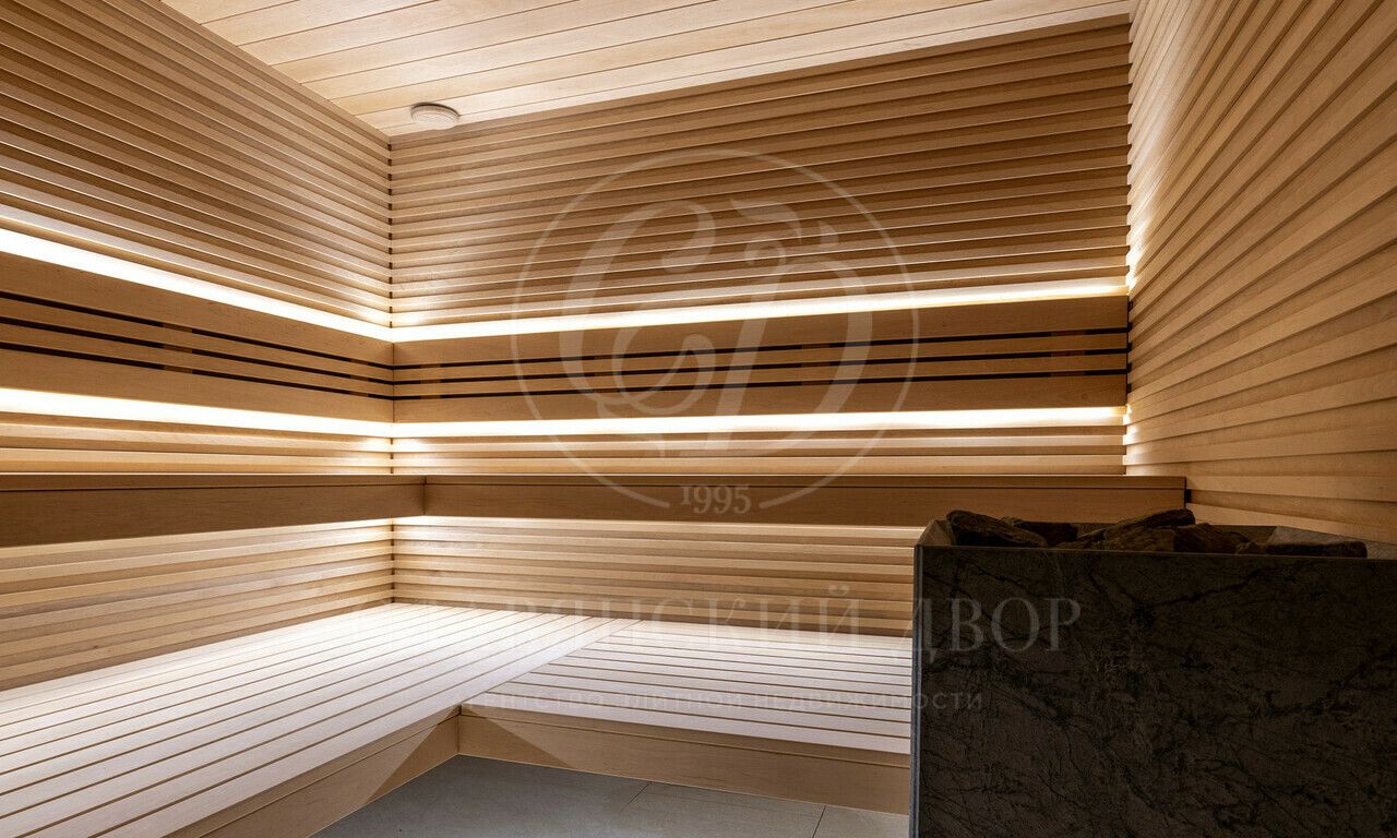 1 этаж: холл, гостиная со вторым светом, столовая, кухня, кладовая, гардеробная — 2 шт., санузел — 3 шт., спальня с ванной комнатой, постирочная, кабинет, бассейн, хаммам, купель, сауна, терраса, котельная, гараж;