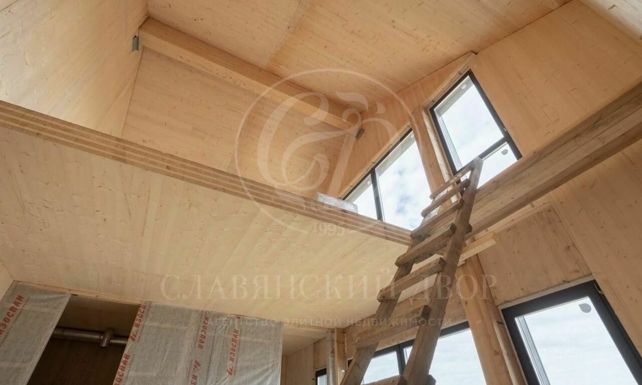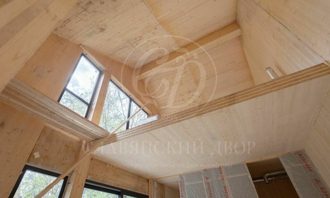 Характеристики: свайный фундамент, SLT-панели (сосна, ель), потолки 3–5 м. Все коммуникации заведены: электричество, газ, скважина, биоочистка, отопление воздушное.
