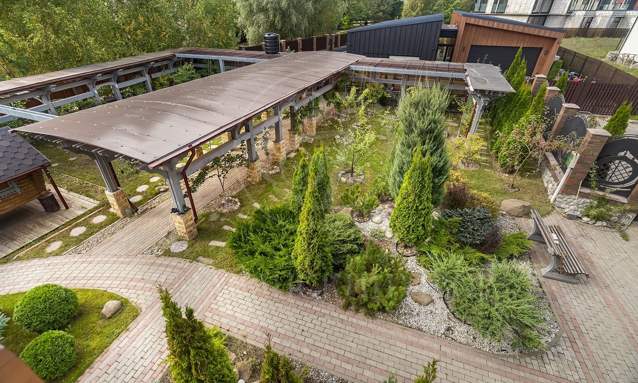 1 этаж: холл, гостиная, с/у, кухня-столовая, каминная, кабинет, автономный блок с парной, комнатой отдыха и спальней на втором этаже, террасы по периметру дома, котельная