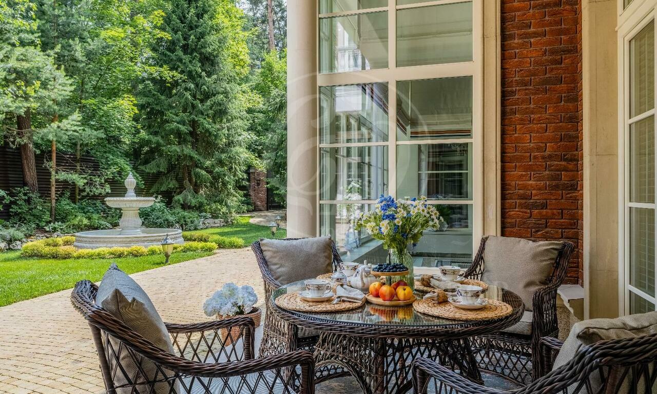 На территории выполнен ландшафт, лесные деревья и кустарники, расположен фонтан, зона барбекю и мягкая зона отдыха.
