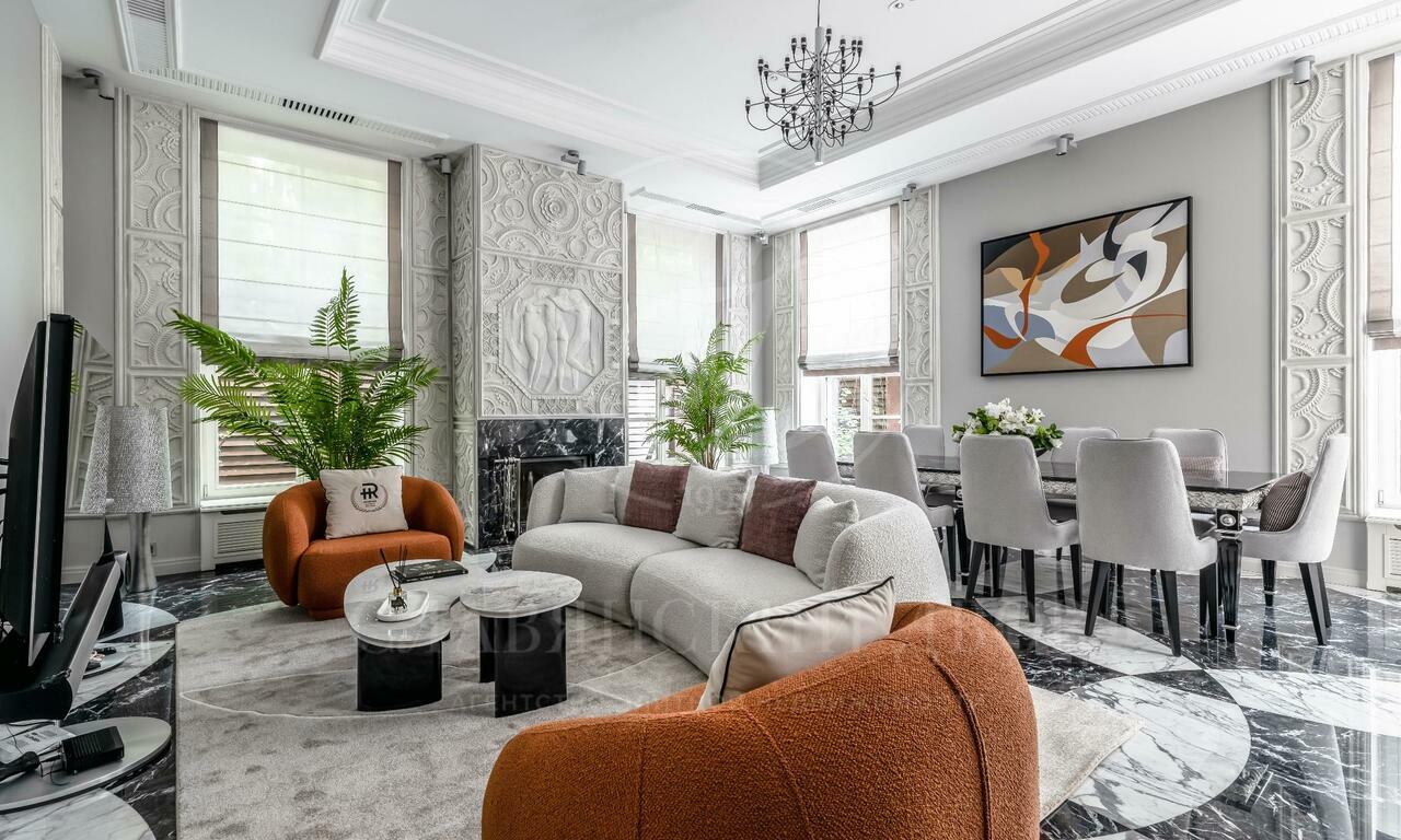 Цокольный этаж: кинотеатр, винный погреб, гардеробная и кладовые, комната для персонала, постирочная, «черная» кухня, сейфовая комната.