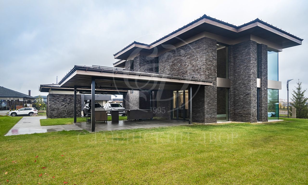 Система «Умный дом» с десятками сценариев: от климата и света до карнизов. Навес на 2 автомобиля. Веранда с тёплым полом и безрамным остеклением гармошкой.
