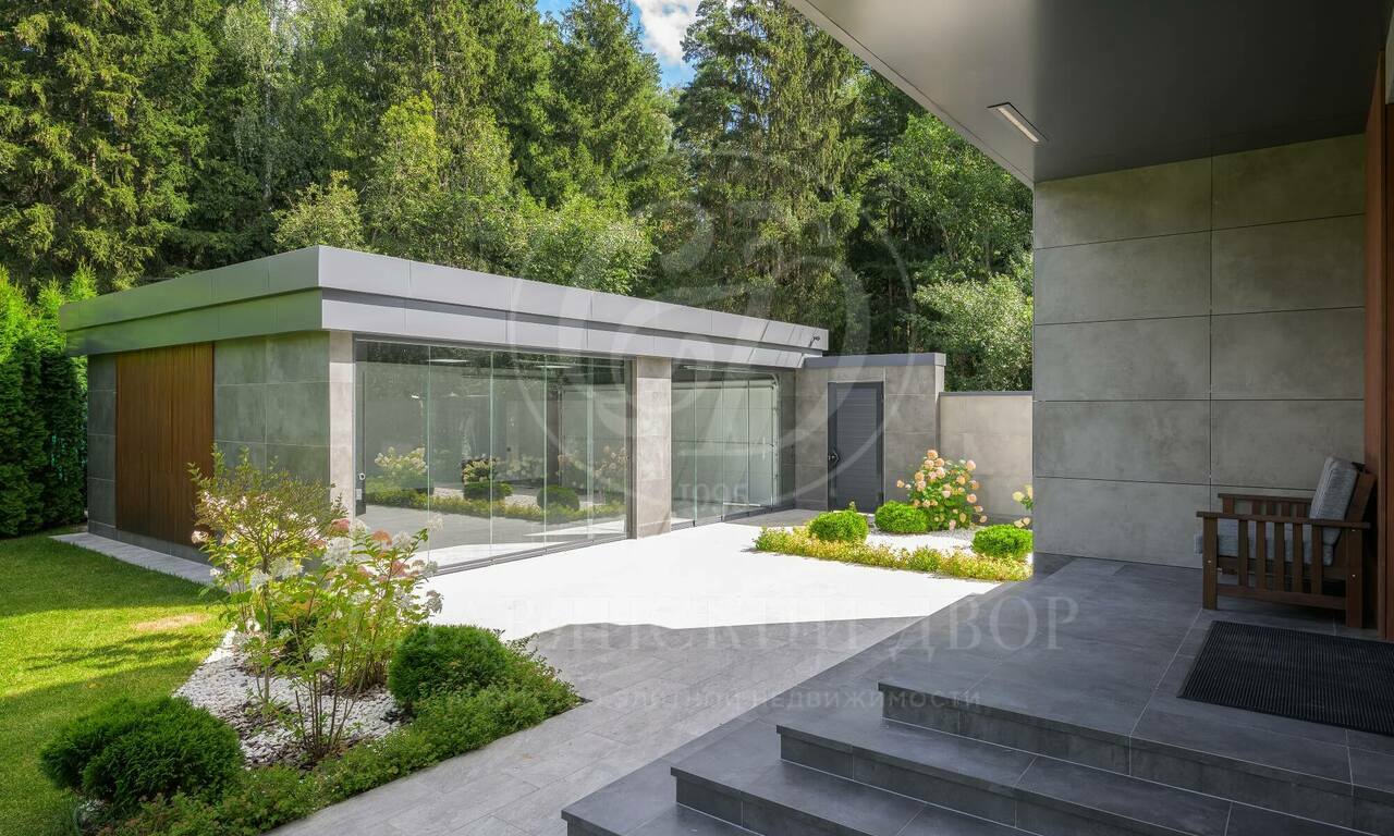 Основной дом архитектурно объединен второй гостиной с большой баней из клееного бруса.
