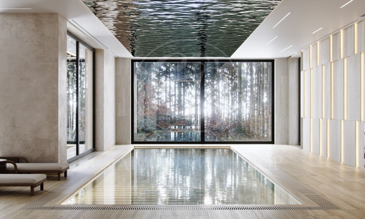 1 этаж: холл, гостевой санузел, гостиная-кухня-столовая, black kitchen, кабинет, гардероб, бассейн, сауна, хаммам, раздевалка, душевая, санузел, спортивный зал, гостевая спальня с санузлом и гардеробной, серверная, котельная, гараж.