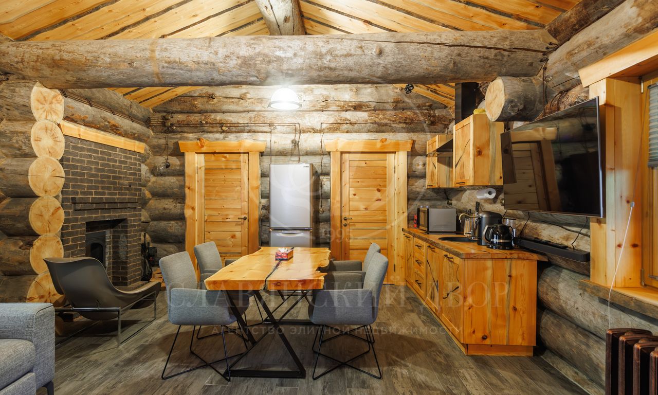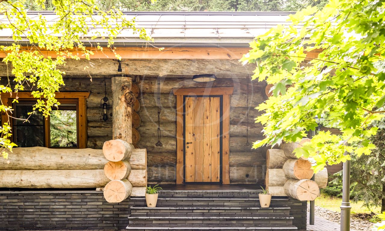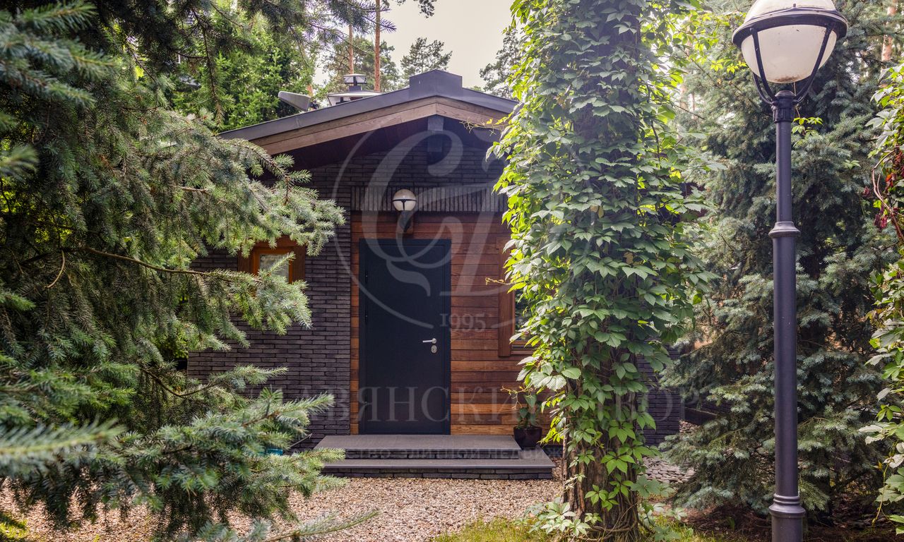 На лесном сосновом участке дополнительно установлена детская игровая площадка и бревенчатая баня с комнатой отдыха.