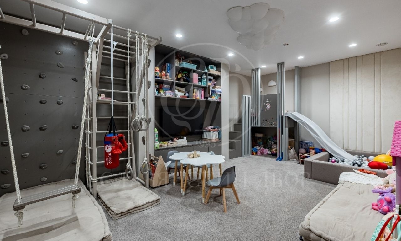 Цокольный этаж: квартира для персонала: 2 комнаты, с/у, кухня; детская игровая, постирочная, спортзал, лифт, гараж на 2 машины, котельная, техническая комната;