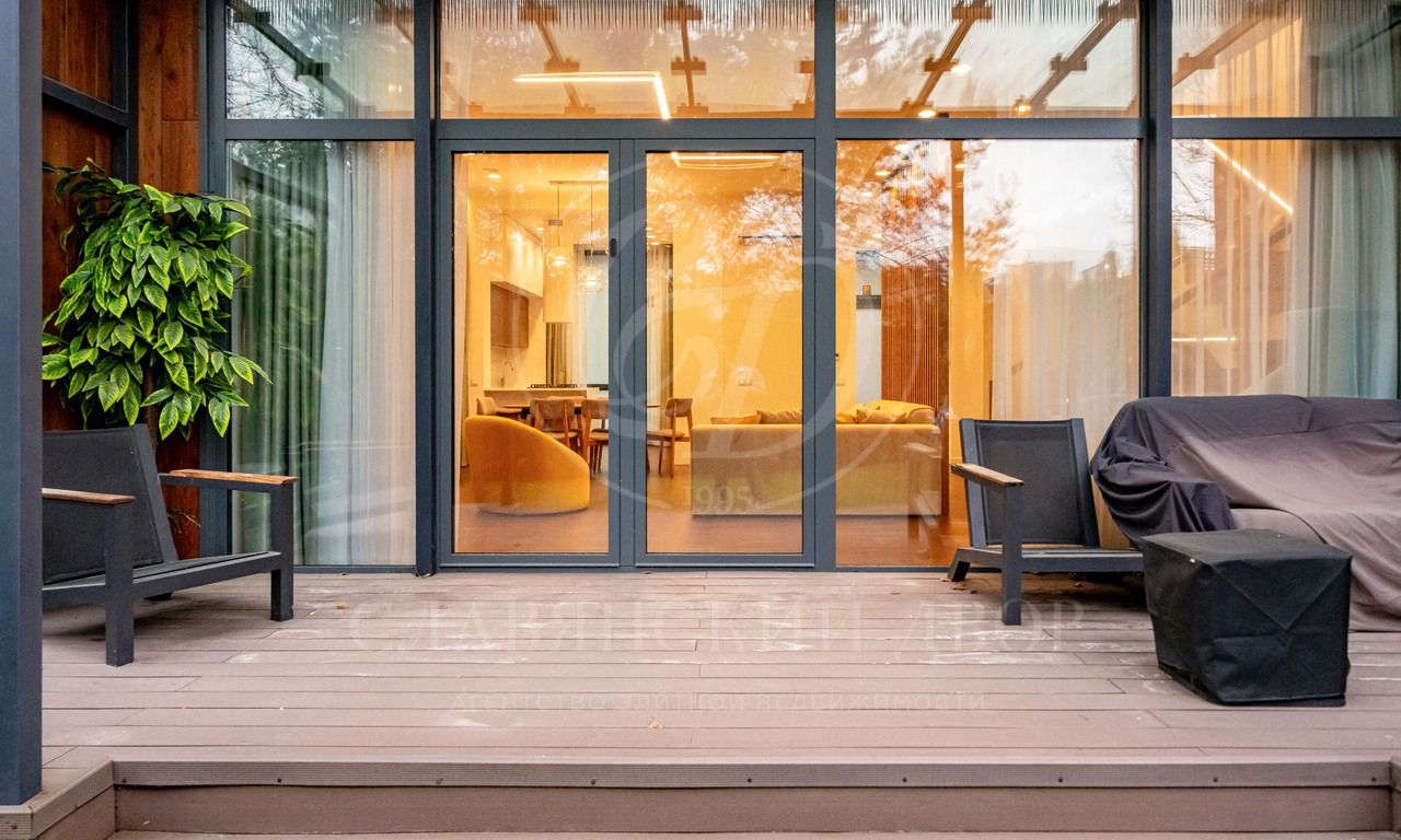 Уличная веранда оборудована кухней столешницей и стеклянной верандой.