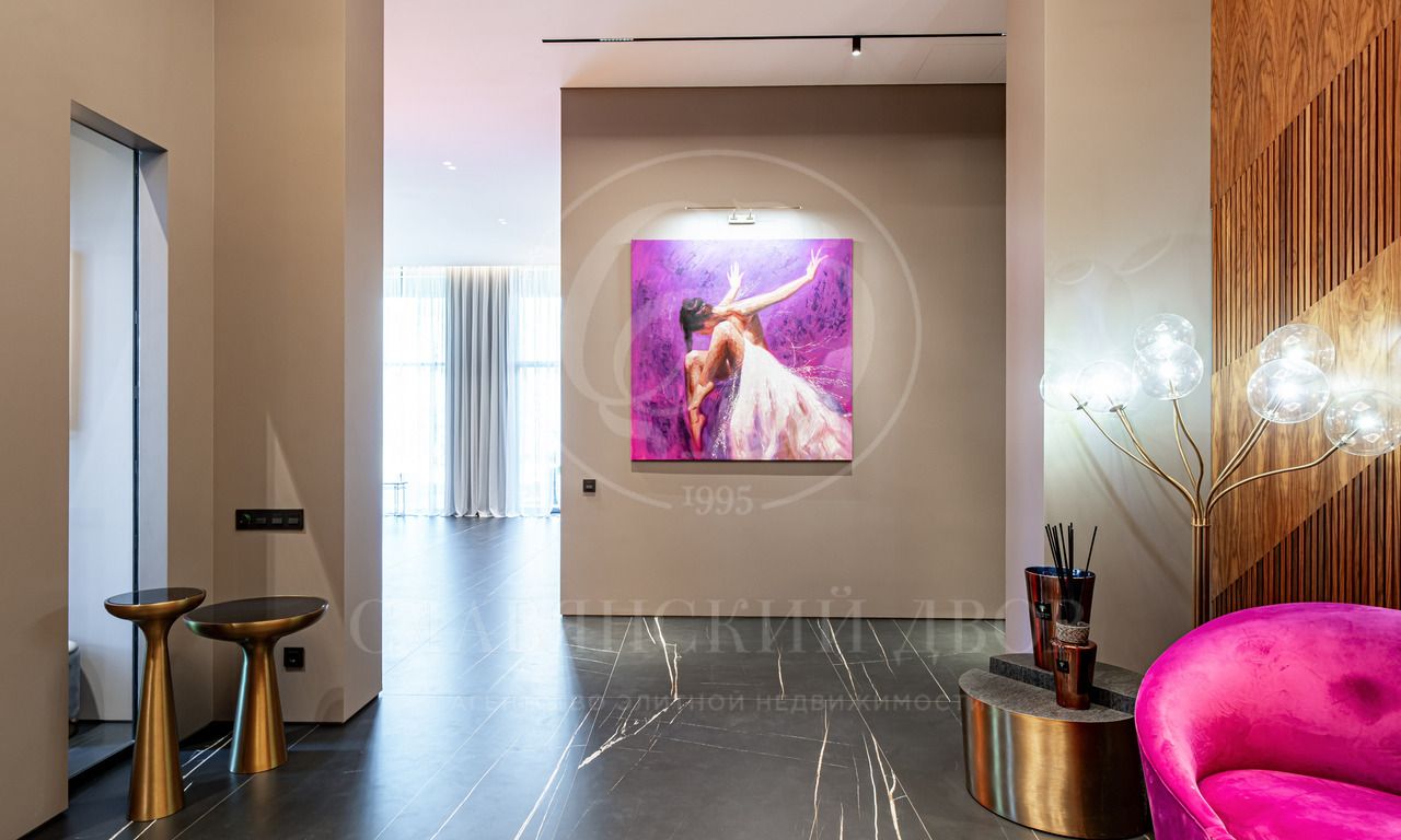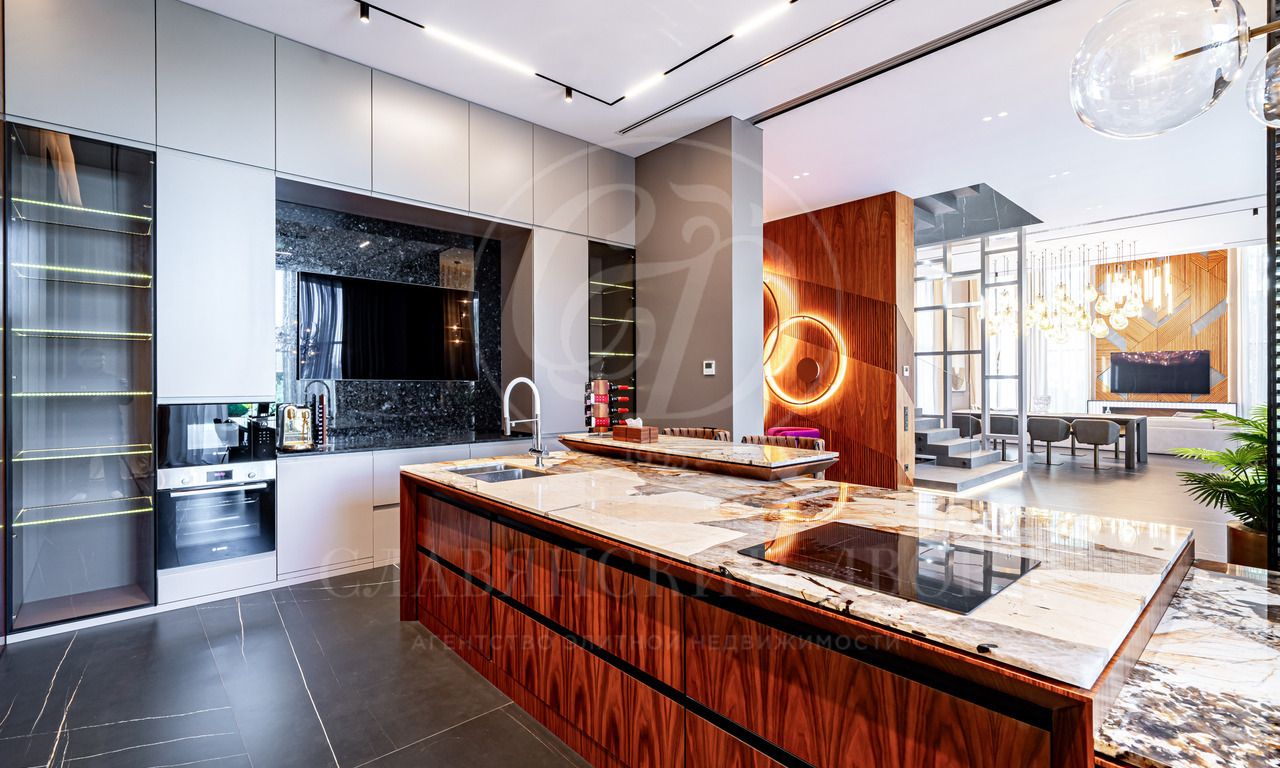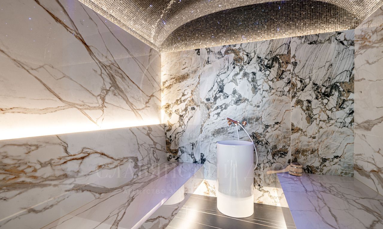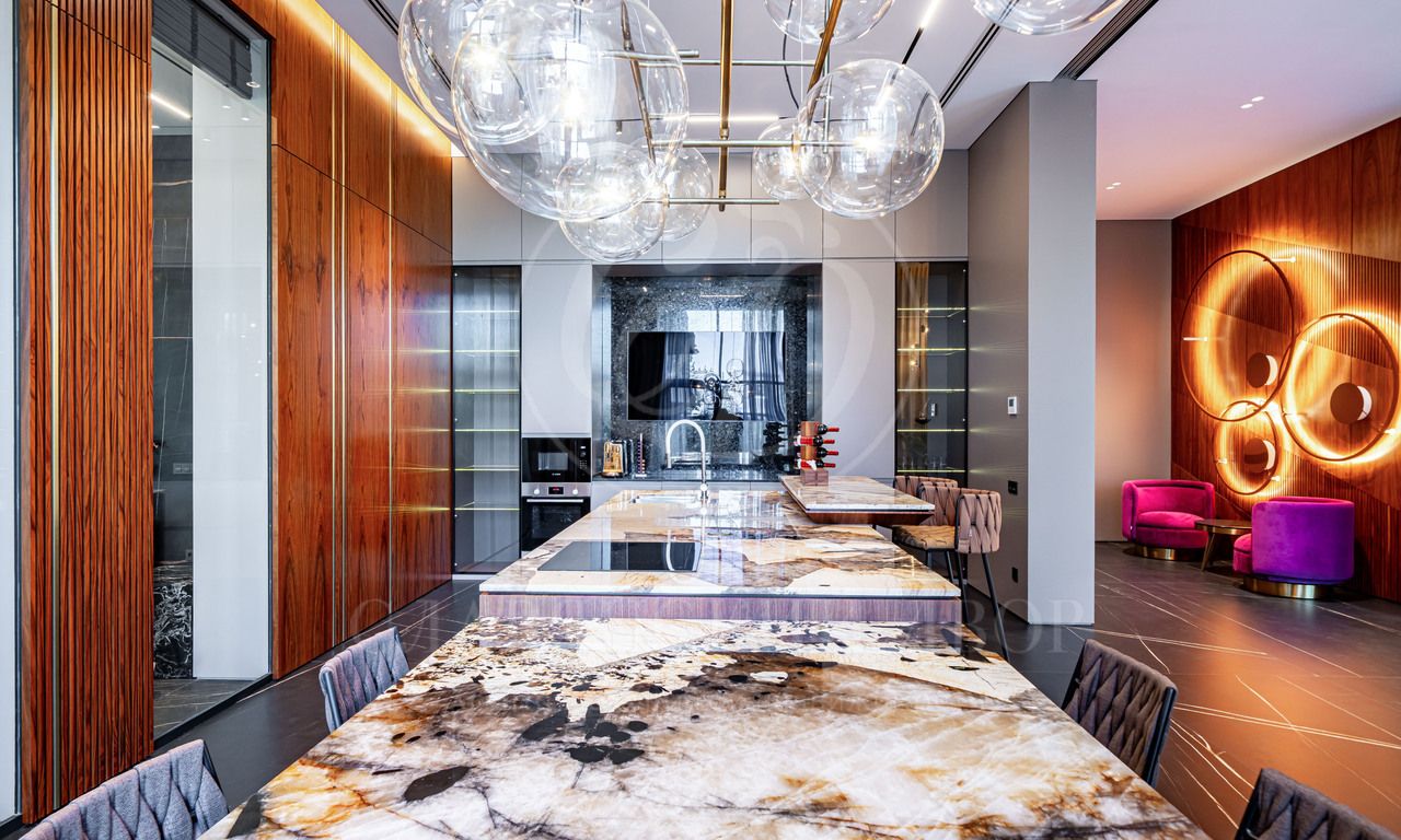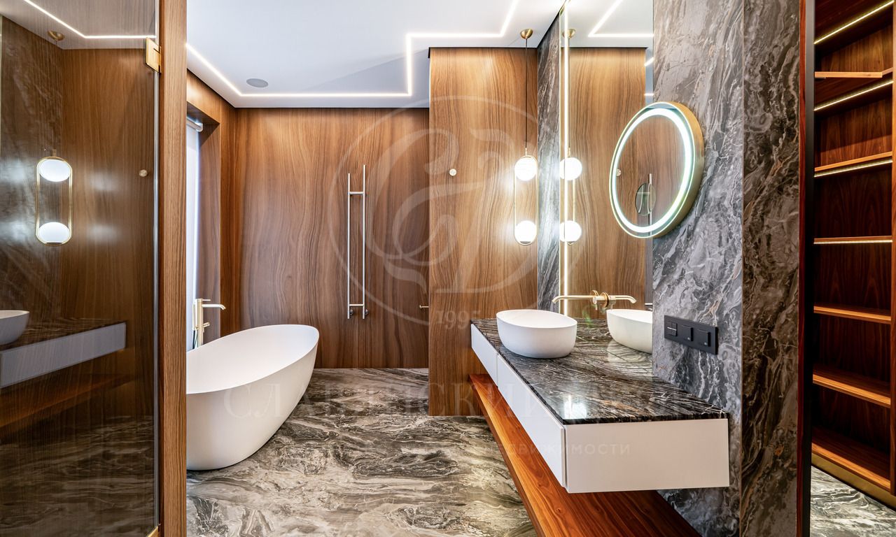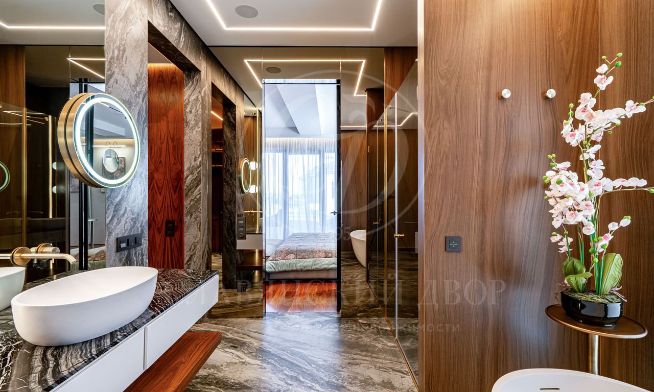 В отделке использованы кварцит, редкие породы дерева, итальянская сантехника CEA и Antonio Lupi. Мебель итальянских и португальских брендов «Henge» и «Frato».