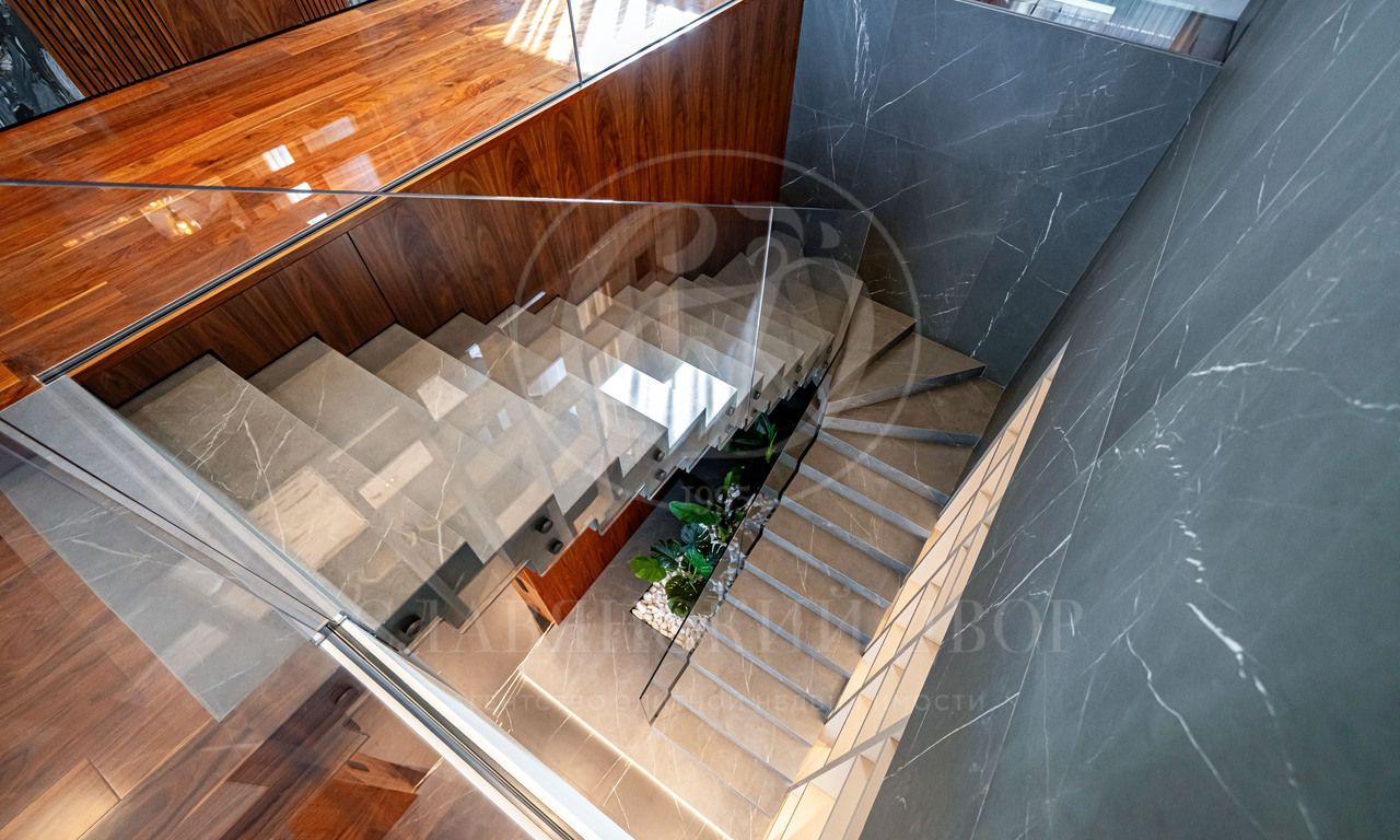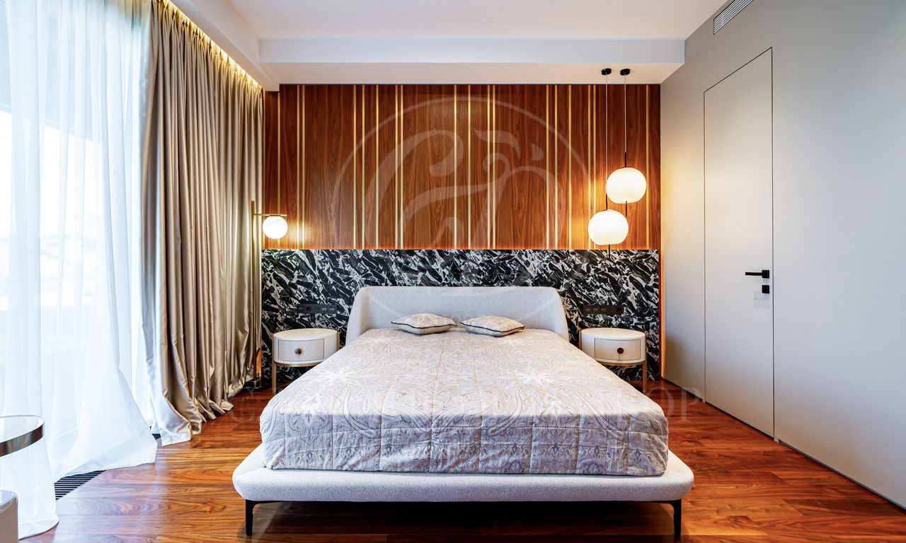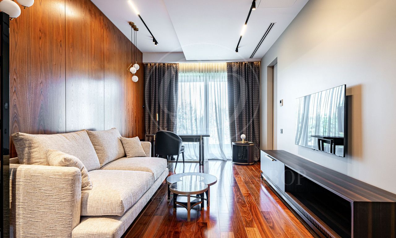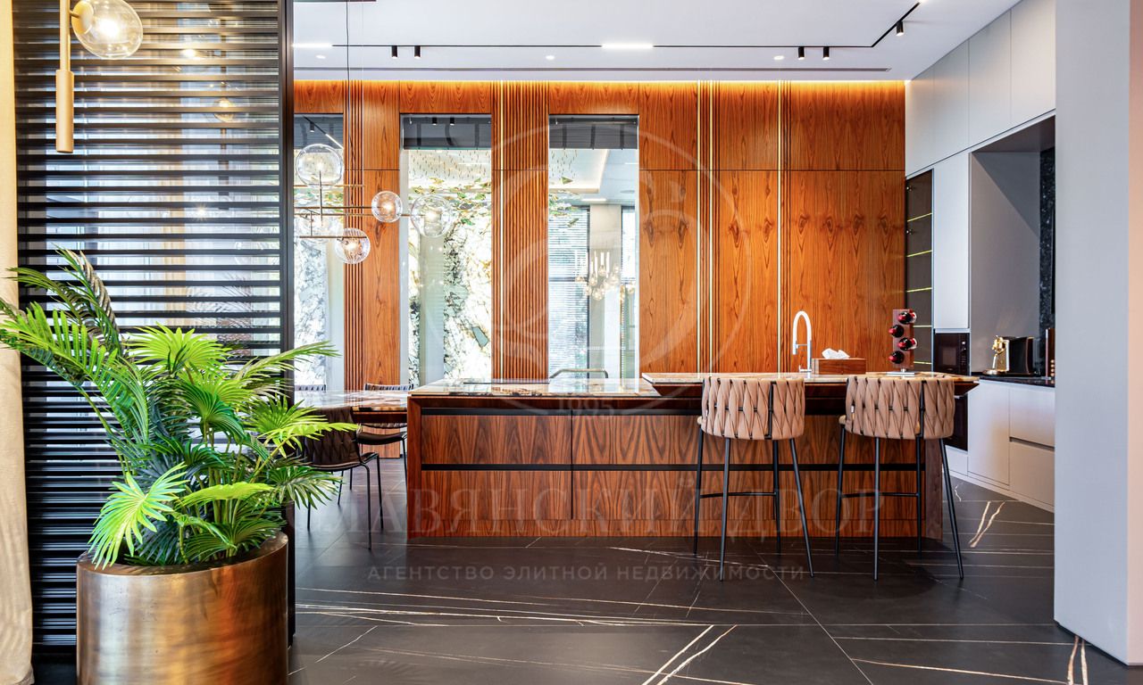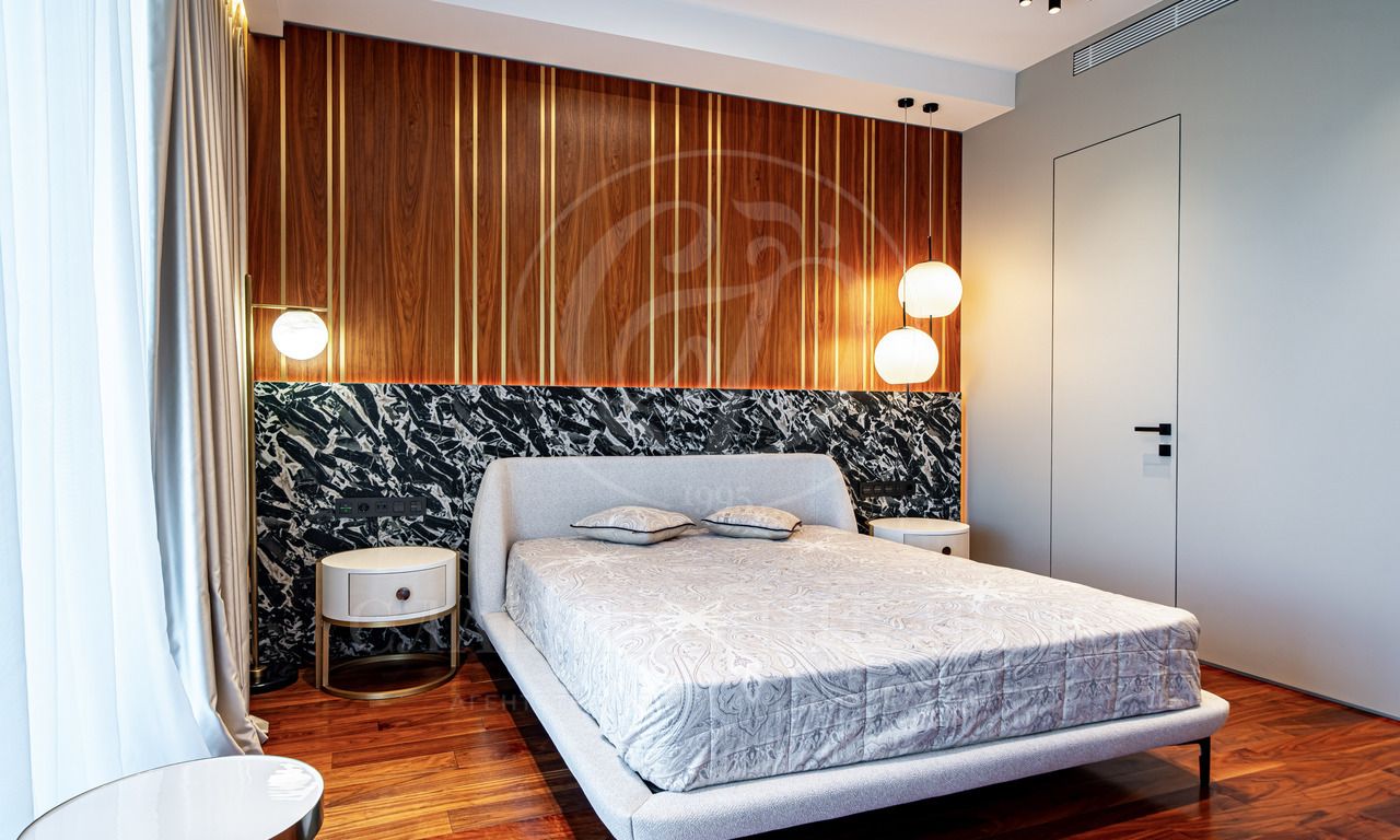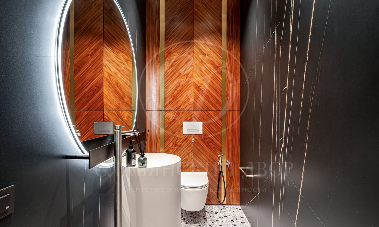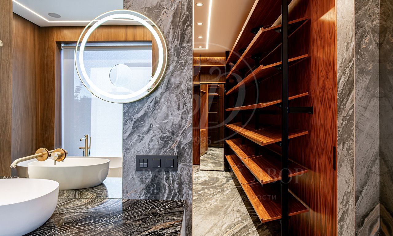 В отделке использованы кварцит, редкие породы дерева, итальянская сантехника CEA и Antonio Lupi. Мебель итальянских и португальских брендов «Henge» и «Frato».