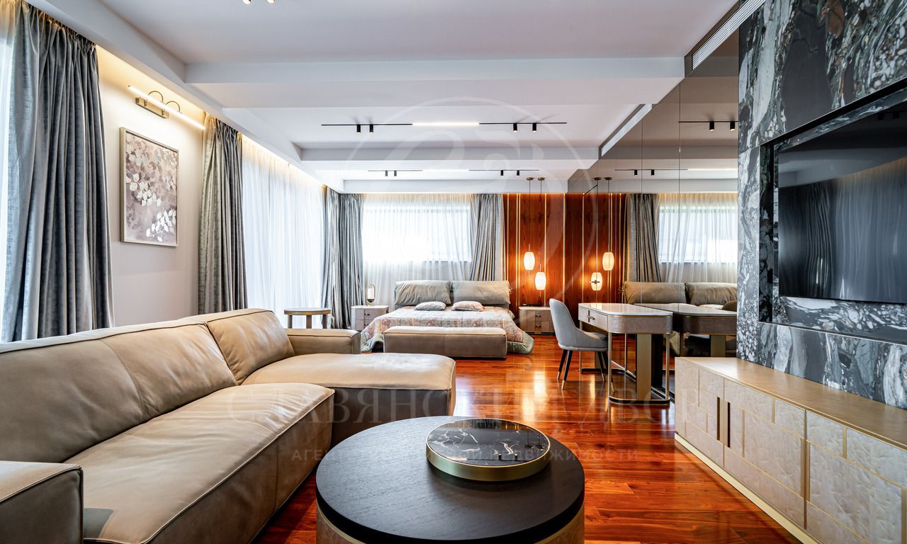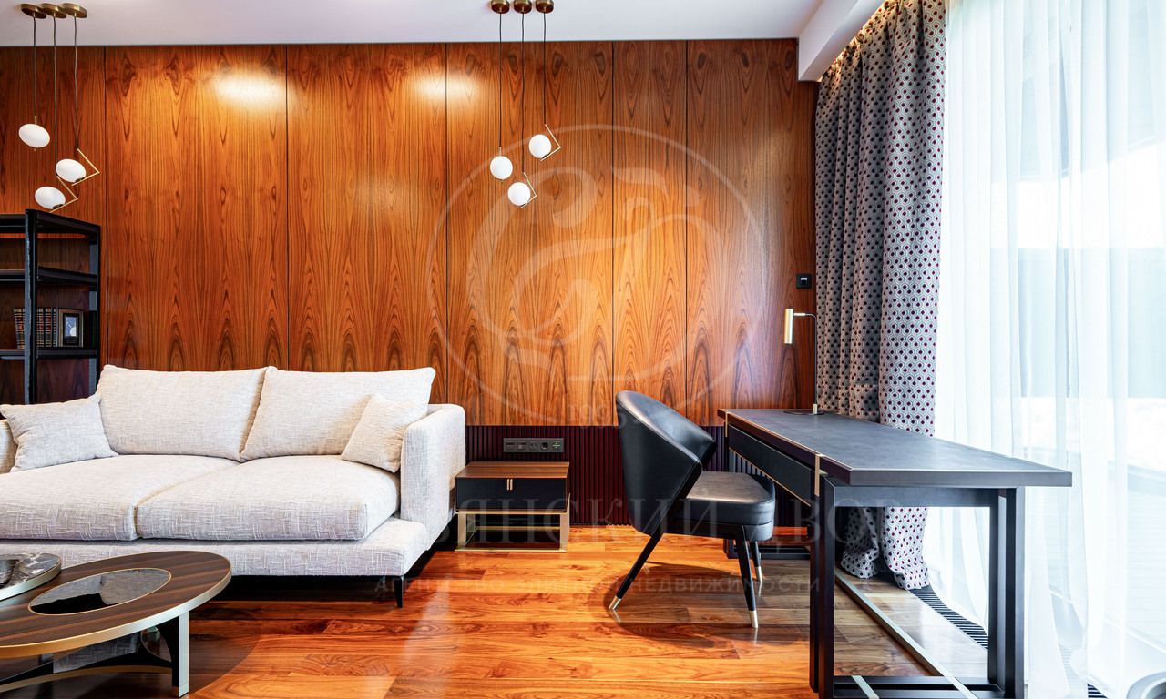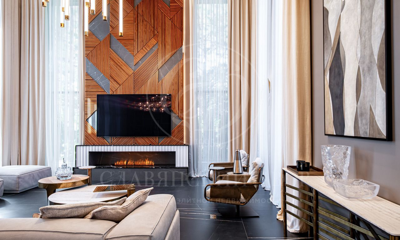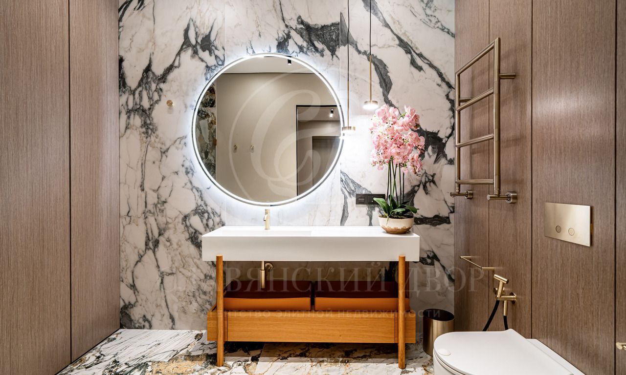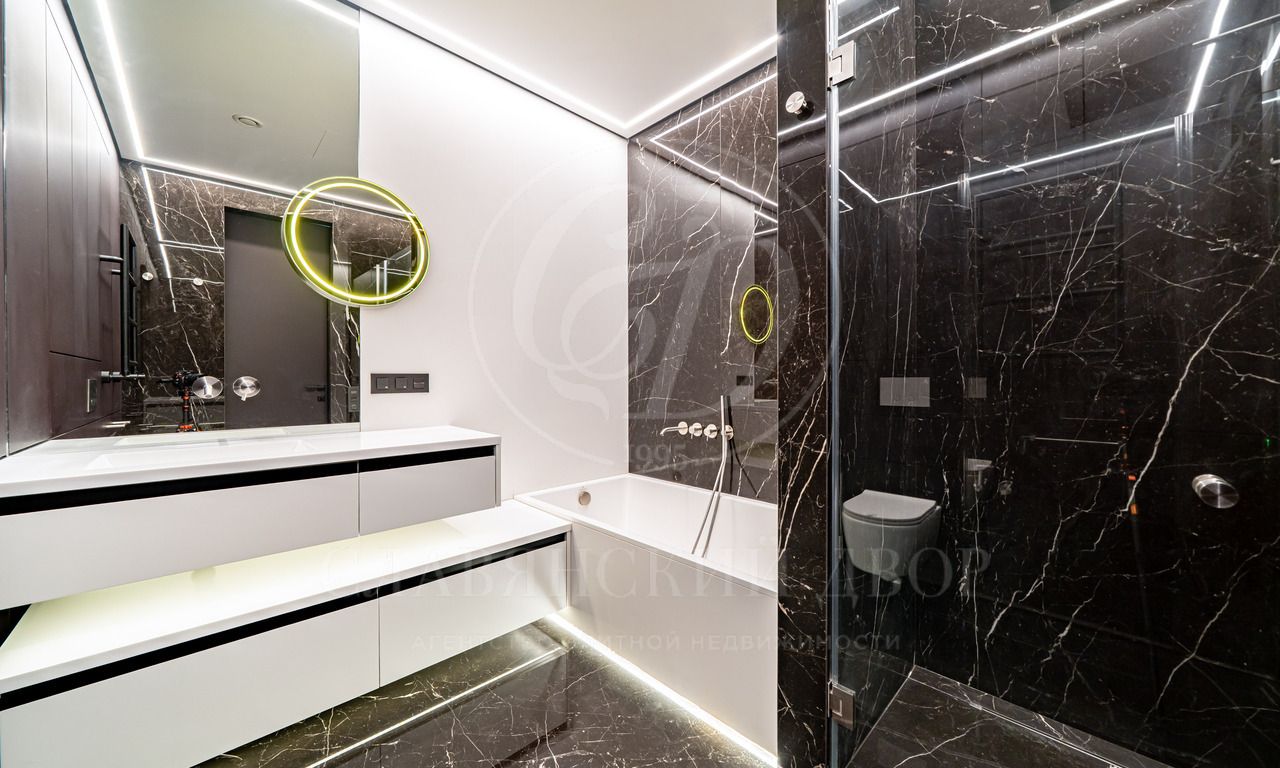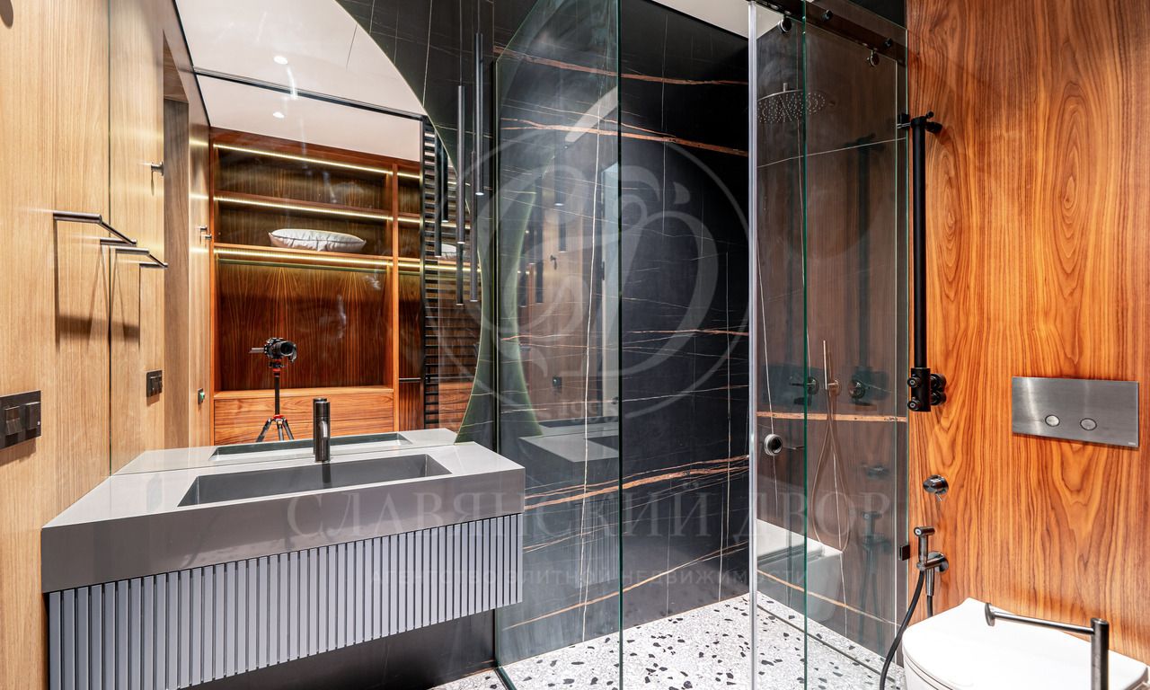 В отделке использованы кварцит, редкие породы дерева, итальянская сантехника CEA и Antonio Lupi. Мебель итальянских и португальских брендов «Henge» и «Frato».