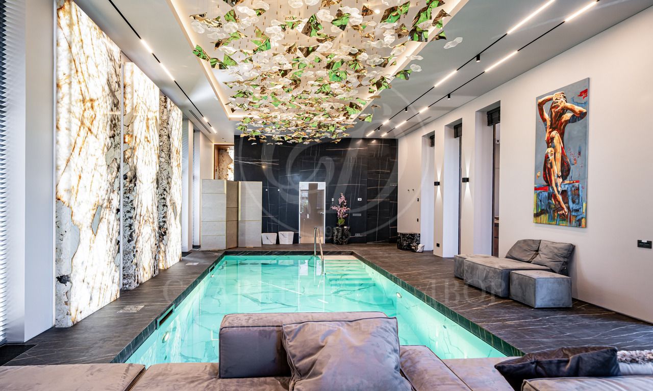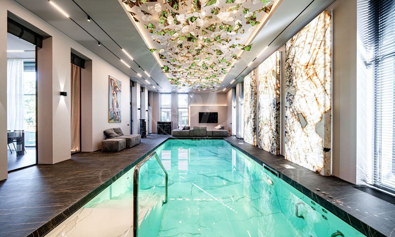 СПА-зона — сердце дома. Бассейн размером 3,6×8 м с системой противотока Aquamaster и зоной гидромассажа дарит ощущение полного расслабления. Панорамное остекление наполняет пространство светом, позволяя наслаждаться видом на участок и природой за окном.