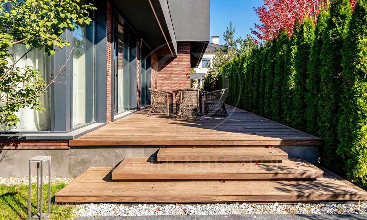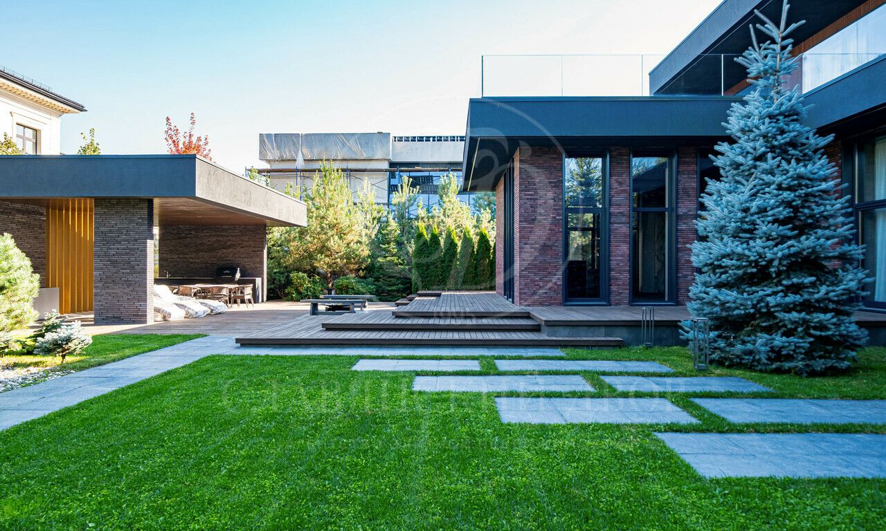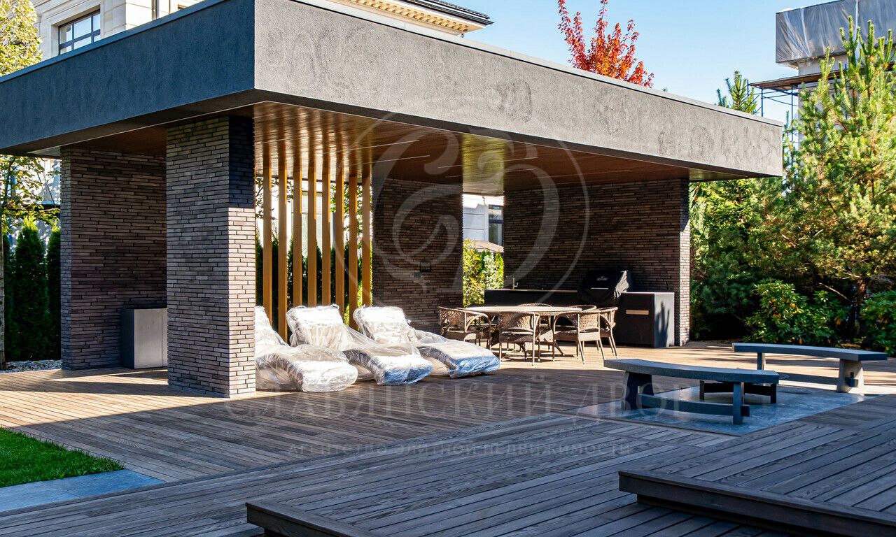 Уличная кухня оборудована техникой Bosch и грилем Napoleon. На участке выполнен ландшафтный дизайн с перголами.