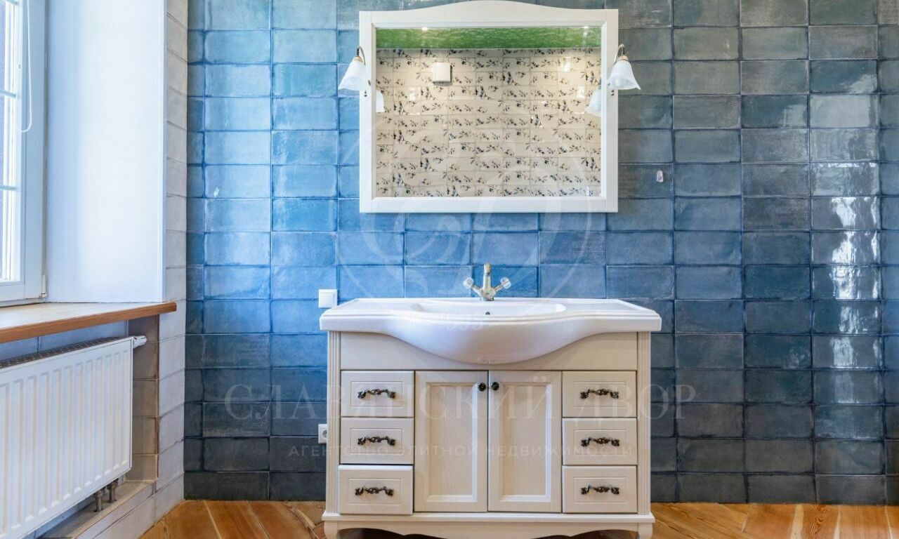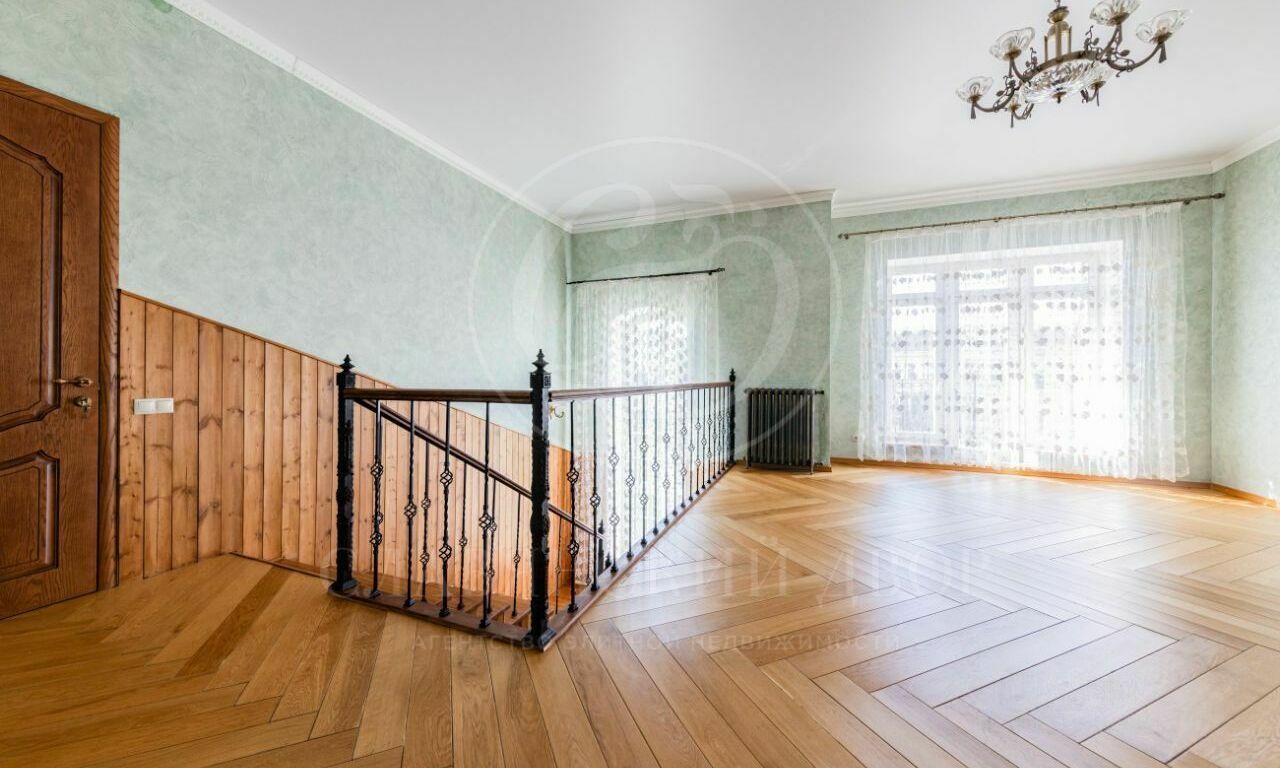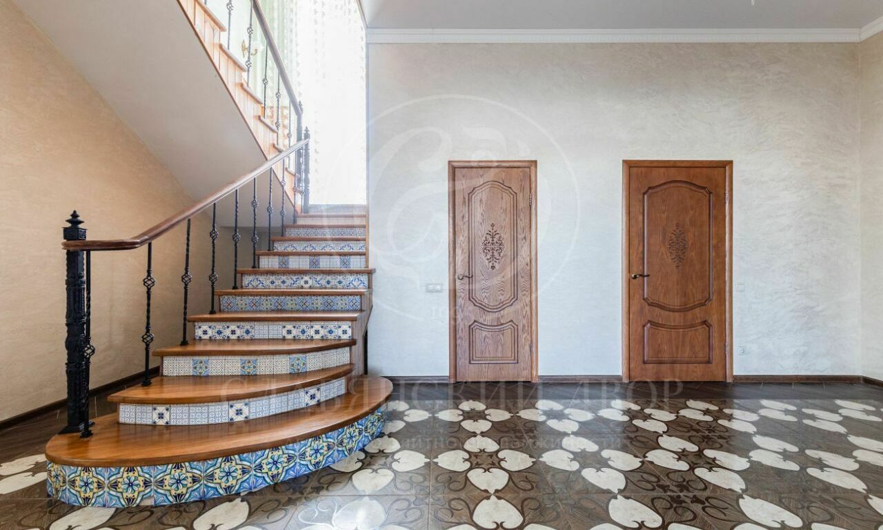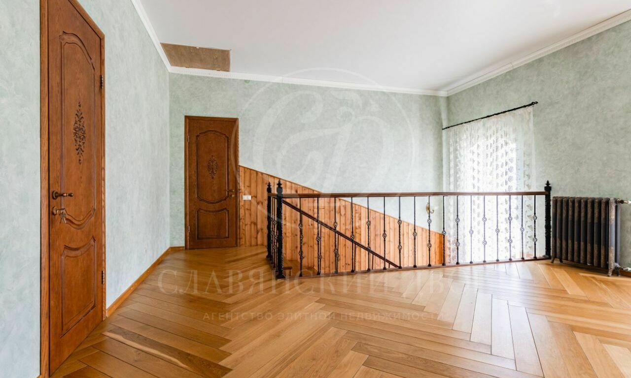 4 мастер‑спальни (каждая с санузлом, душем и гардеробной). Отделка: керамогранит (1‑й этаж), дубовый паркет и лиственница (2‑й этаж). Классическая дубовая лестница с коваными перилами; двери, окна и подоконники — из натурального дерева.
