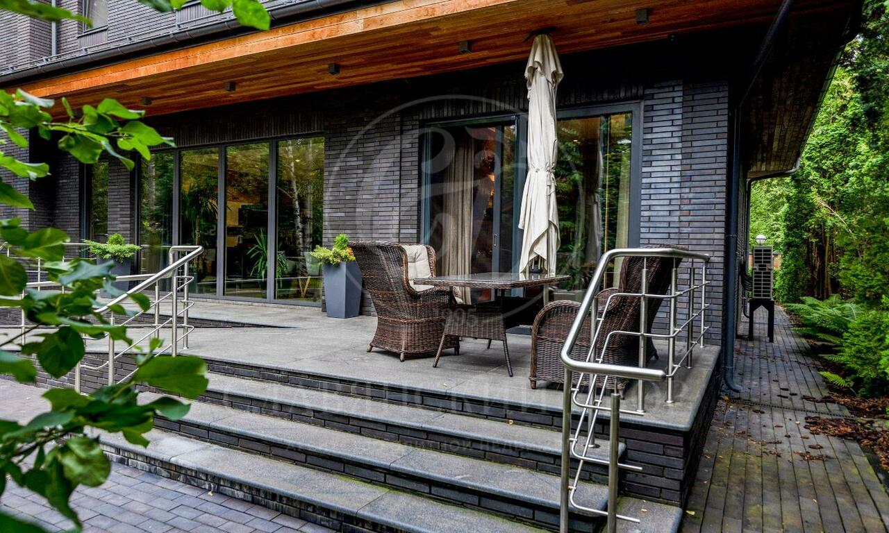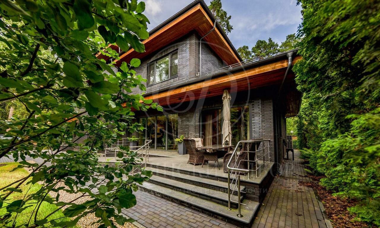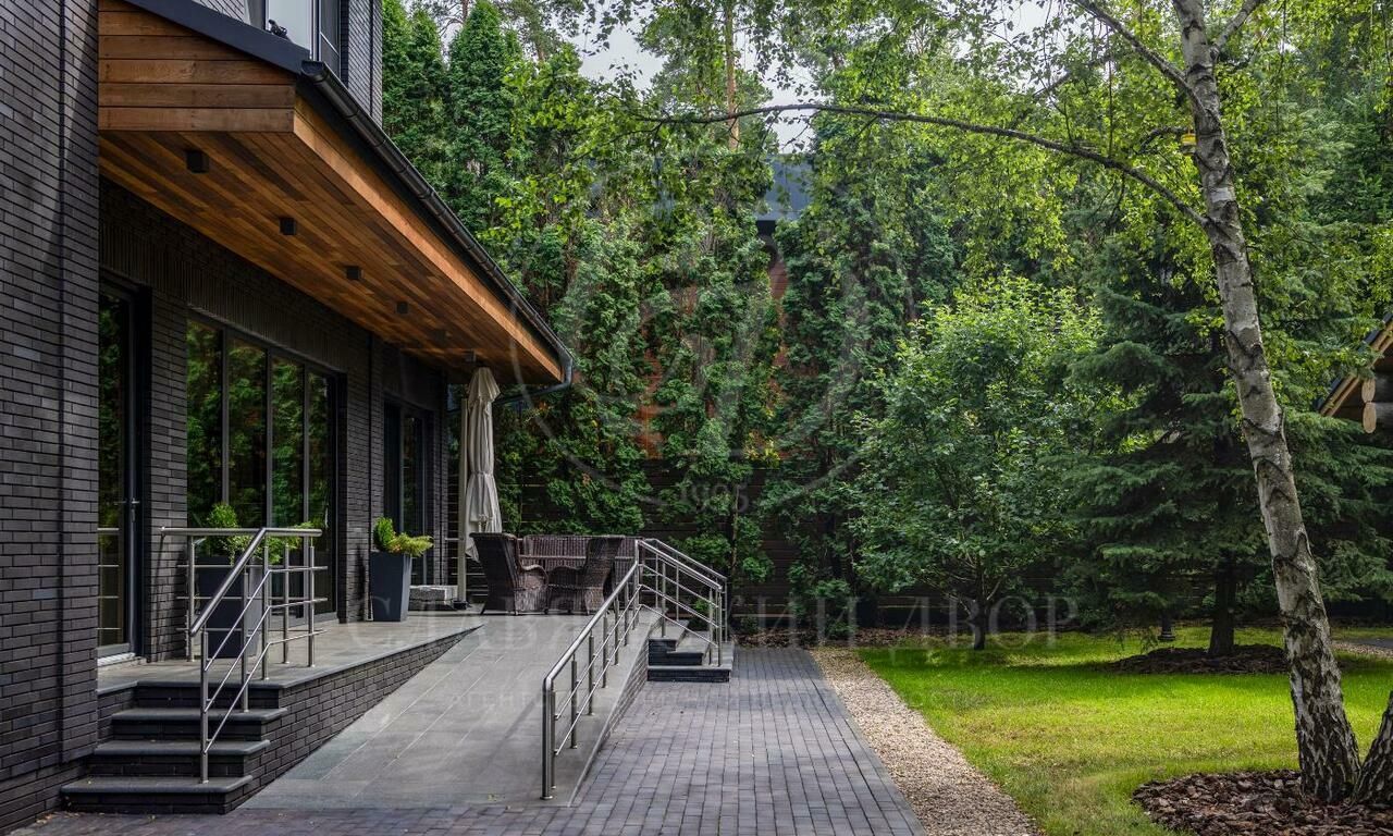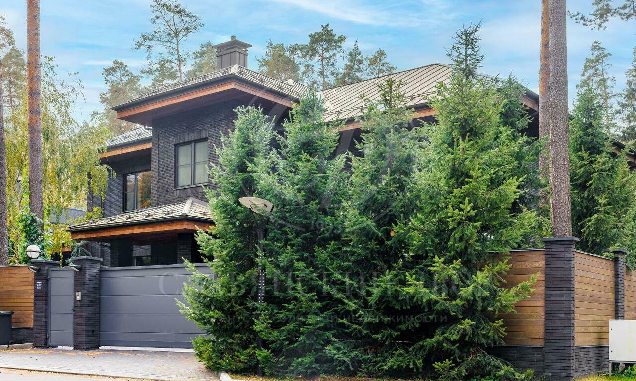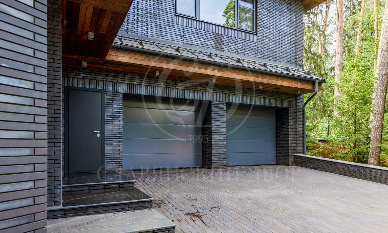 На продажу предлагается двухэтажный загородный дом в современном стиле площадью 440 кв и отдельный СПА-блок расположены на лесном участке 16 соток. Фасад главного дома облицован серо-синим клинкером.