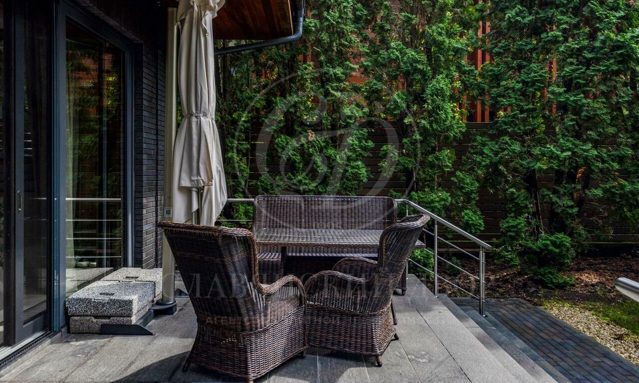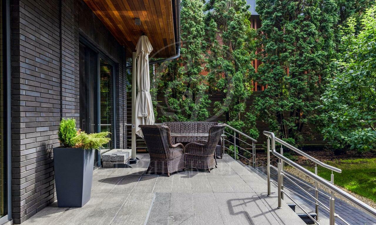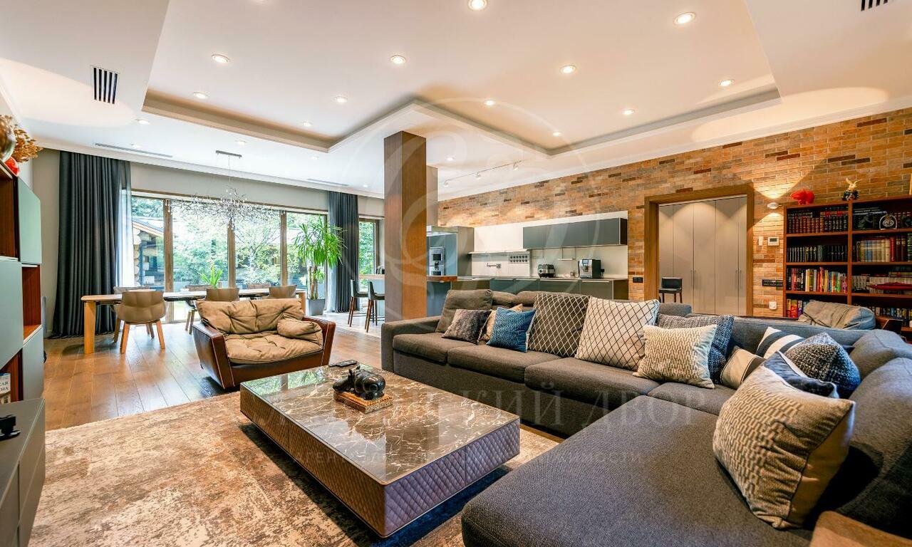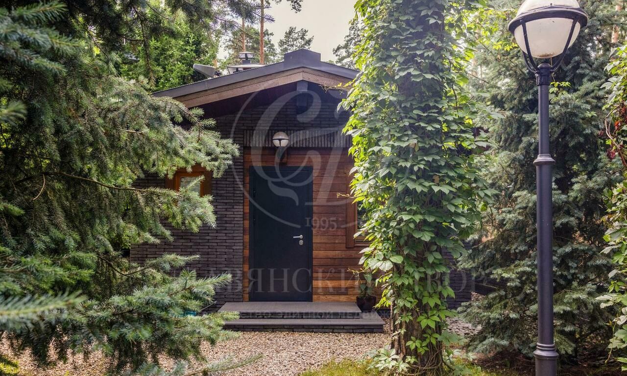 На продажу предлагается двухэтажный загородный дом в современном стиле площадью 440 кв и отдельный СПА-блок расположены на лесном участке 16 соток. Фасад главного дома облицован серо-синим клинкером.