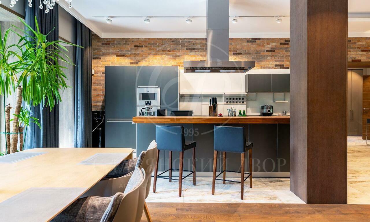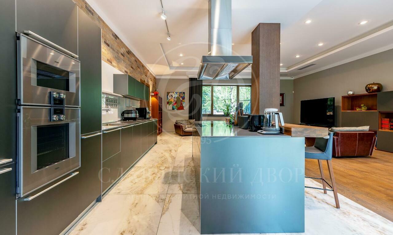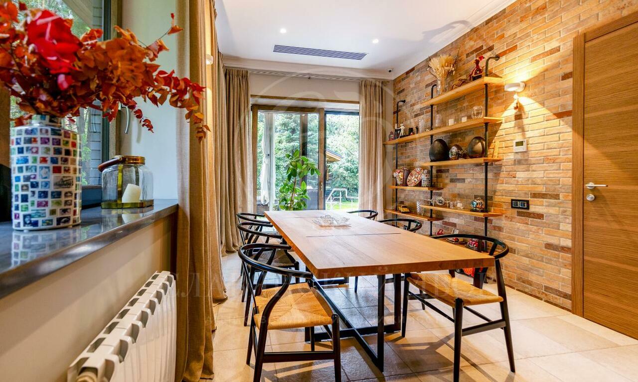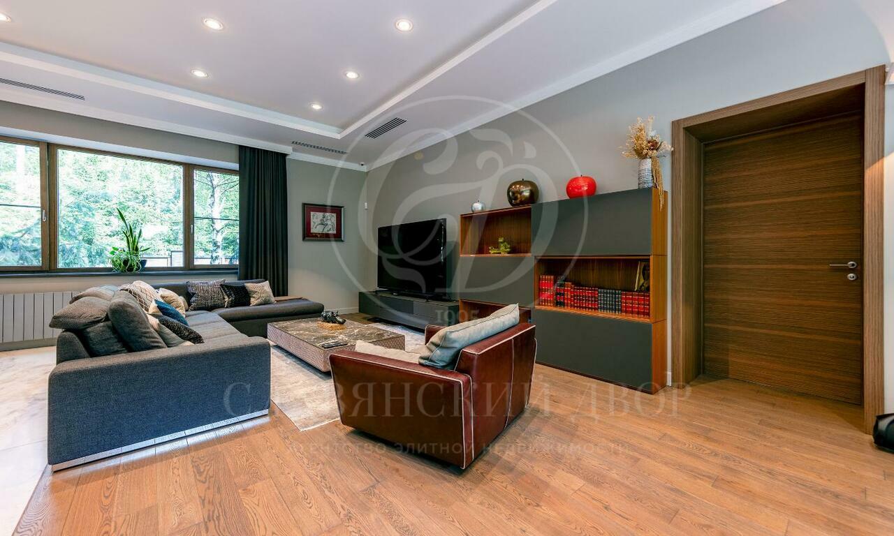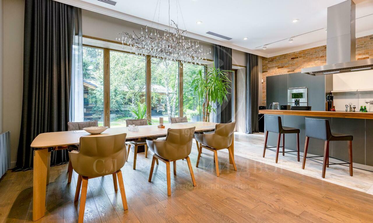 На продажу предлагается двухэтажный загородный дом в современном стиле площадью 440 кв и отдельный СПА-блок расположены на лесном участке 16 соток. Фасад главного дома облицован серо-синим клинкером.