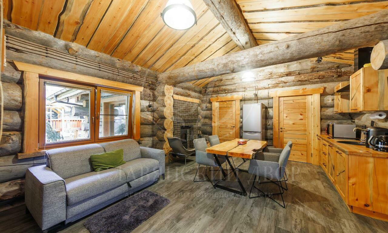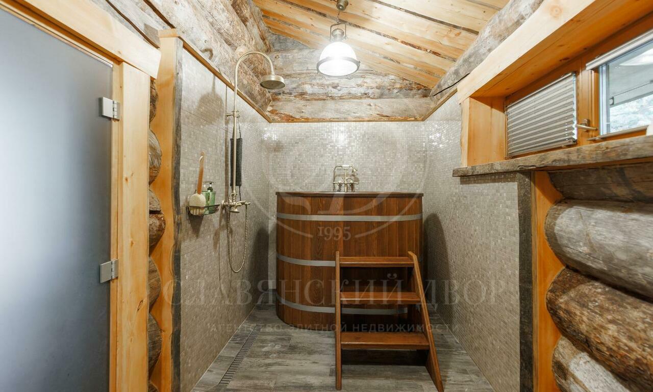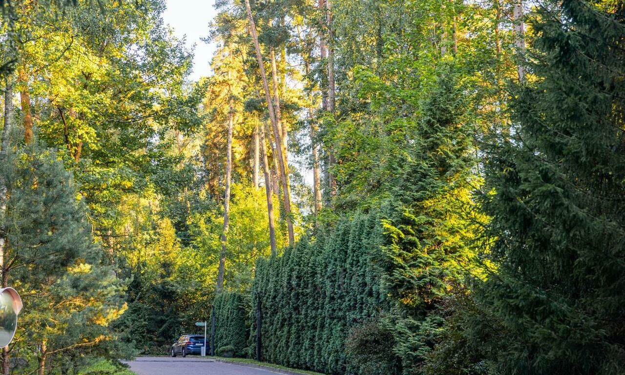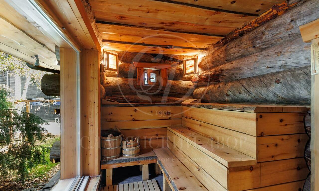 На участке с соснами провели ландшафтные работы, установили детскую площадку и построили отдельную бревенчатую баню с комнатой отдыха. Машину можно оставить в двойном закрытом гараже в доме, или на участке около ворот.