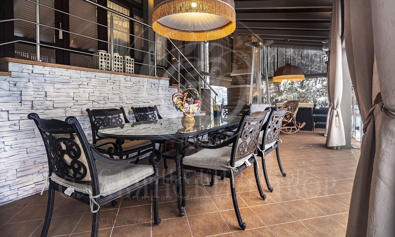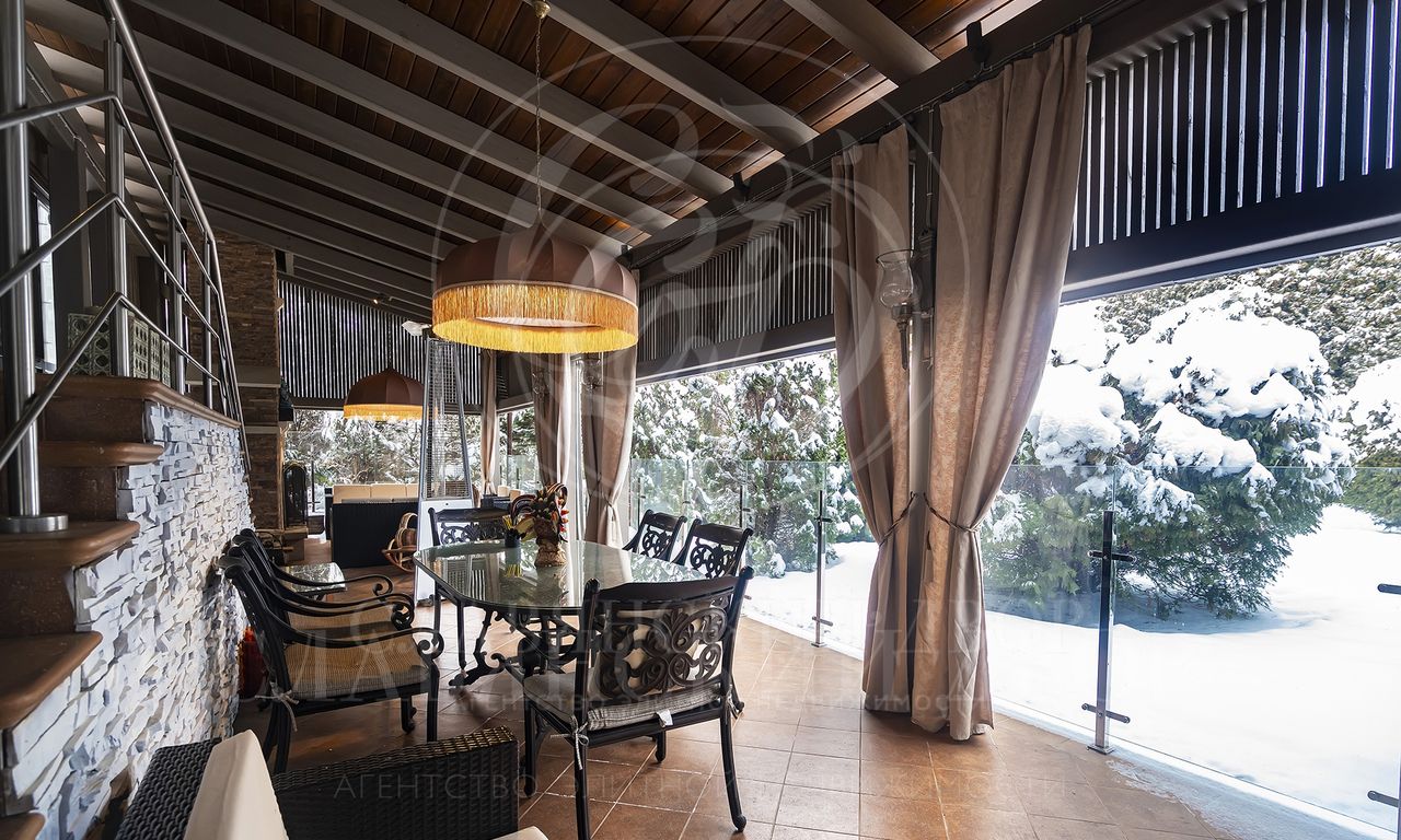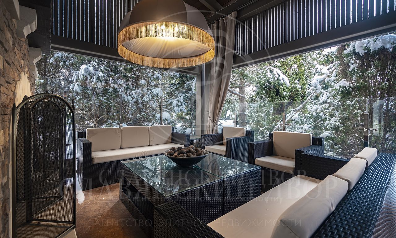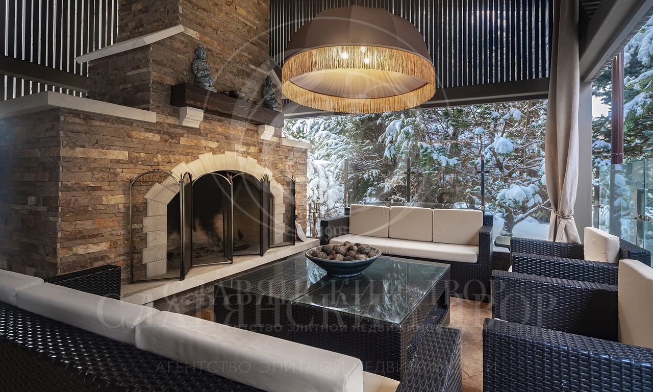 Патио: Большой уличный камин, стеклянное ограждение, клееный брус, ПВХ шторы на зиму, высокие потолки, пол и лестница клинкер, плетеная мебель.