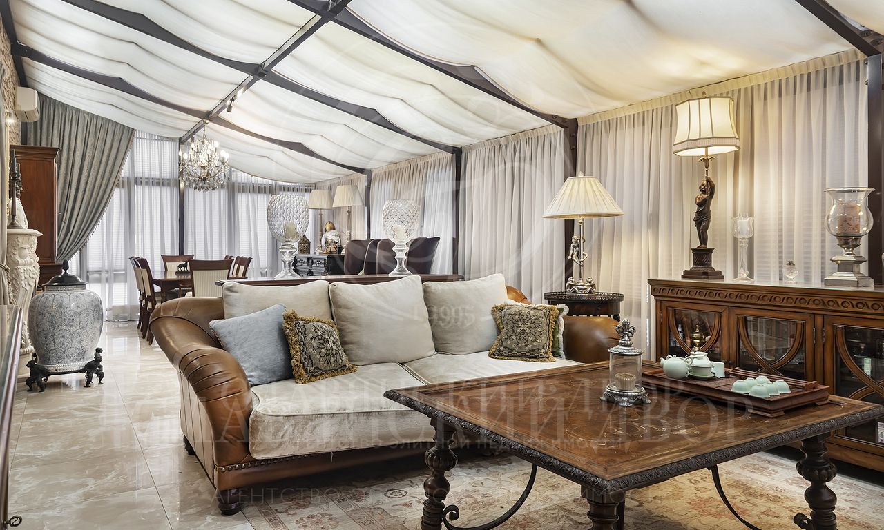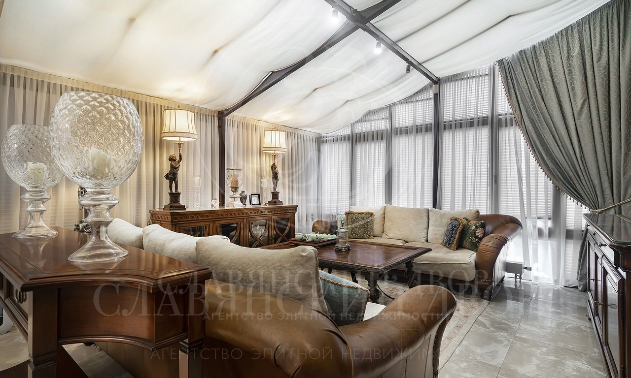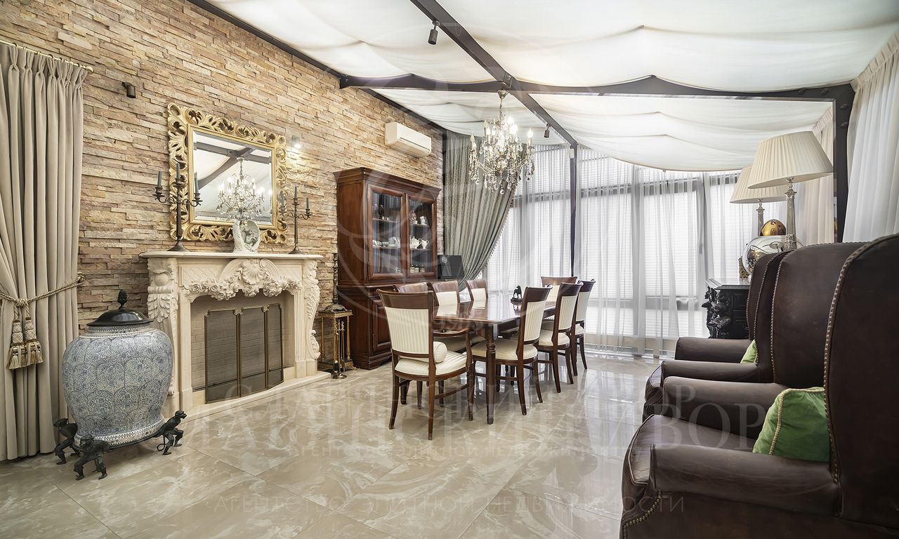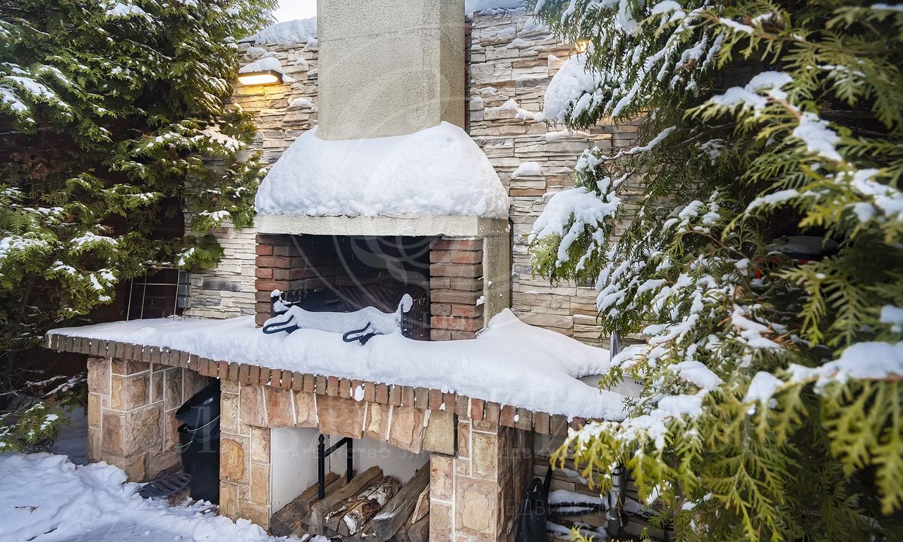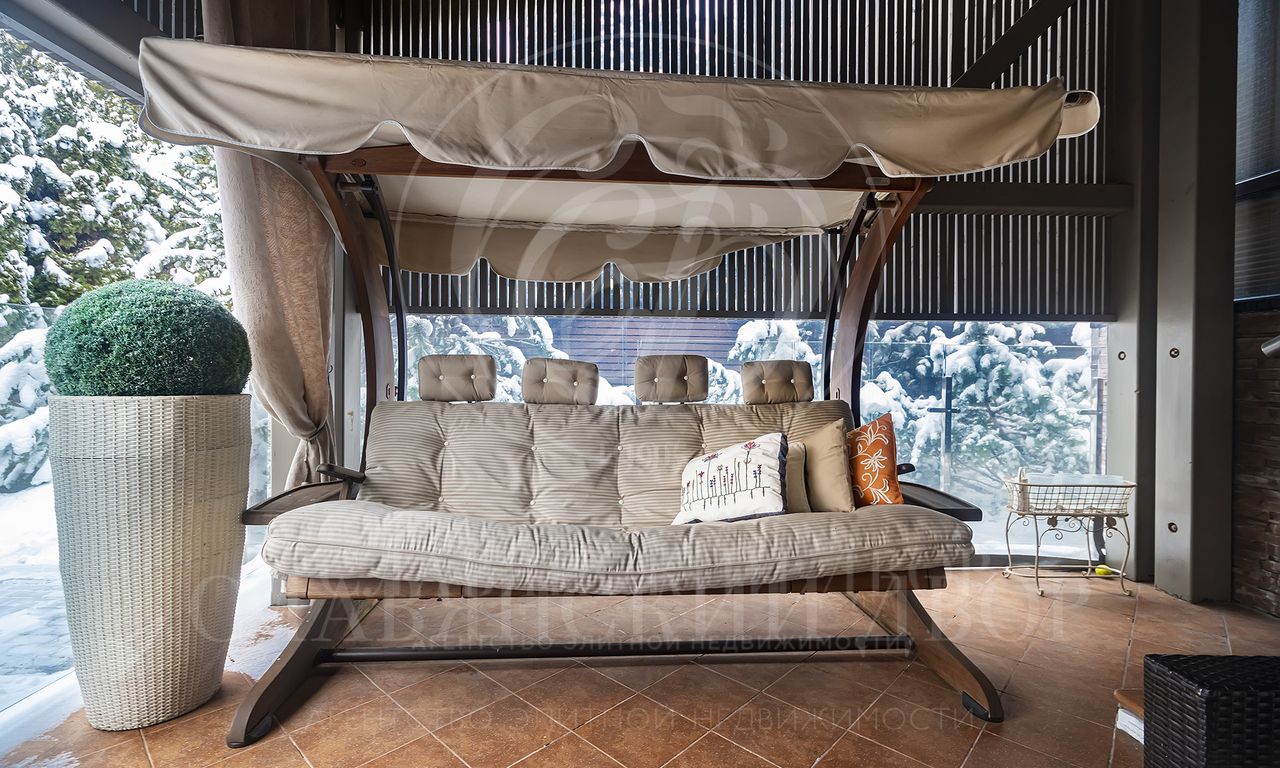 Патио: Большой уличный камин, стеклянное ограждение, клееный брус, ПВХ шторы на зиму, высокие потолки, пол и лестница клинкер, плетеная мебель.