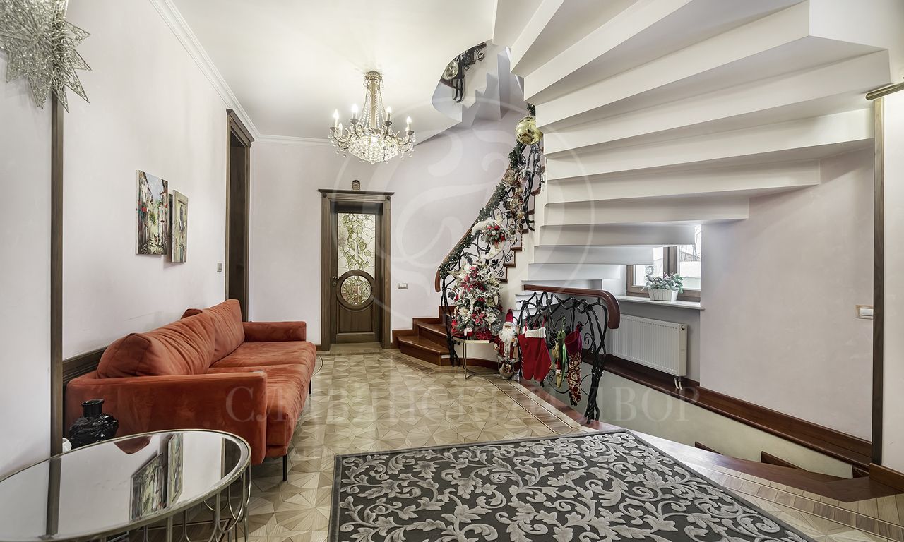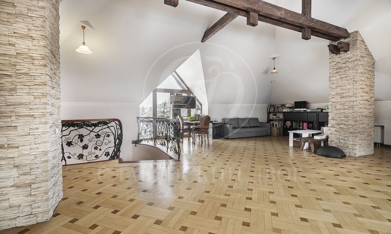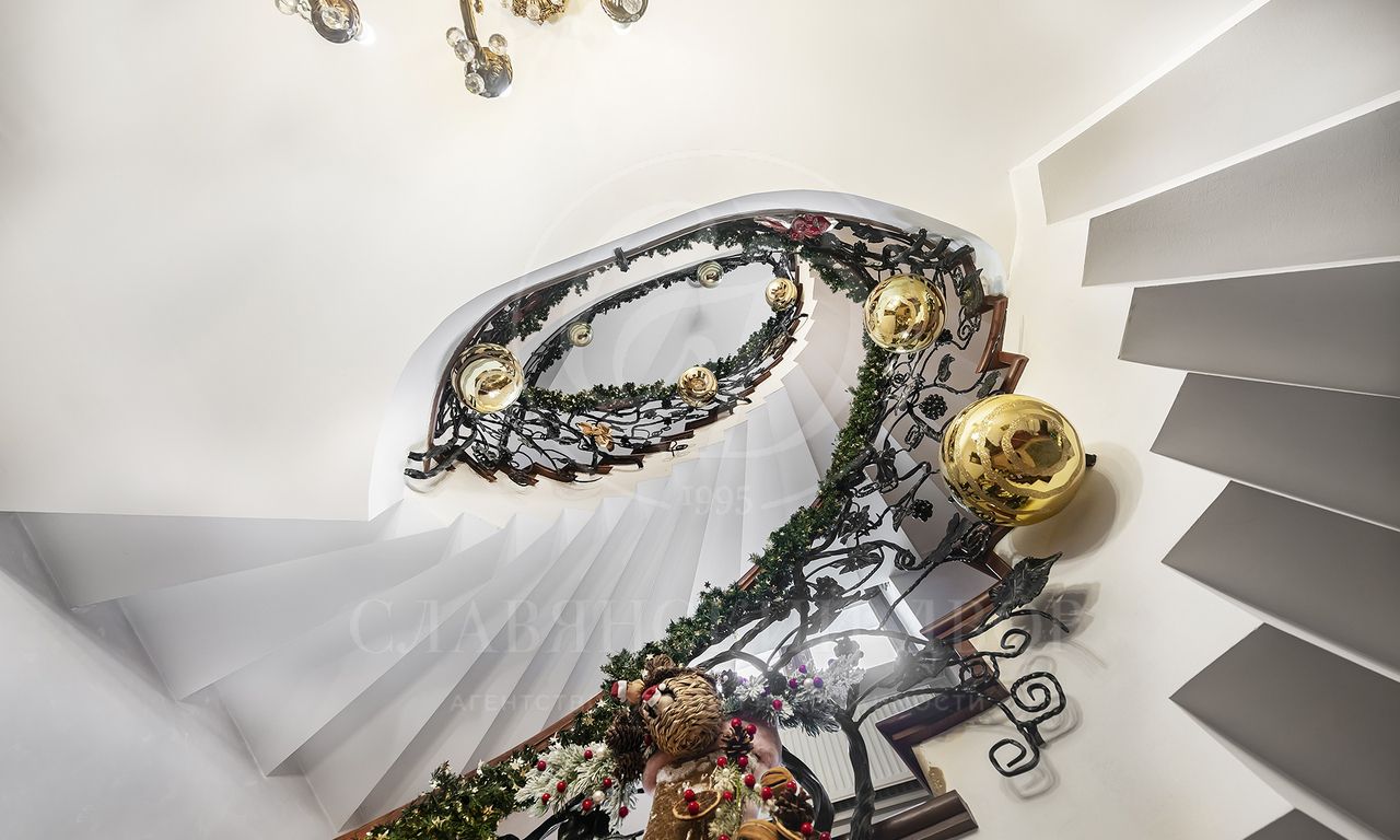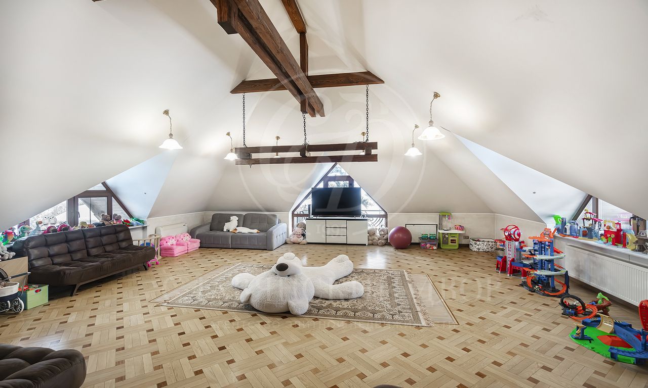 Особенности и преимущества дома: высококачественный ремонт, эксклюзивный паркет ручной работы, санузлы оснащены итальянской сантехникой, во всех санузлах — тёплые полы, над гаражом — отдельное помещение для персонала с входом, мебелью, санузлом и полноценной кухней.