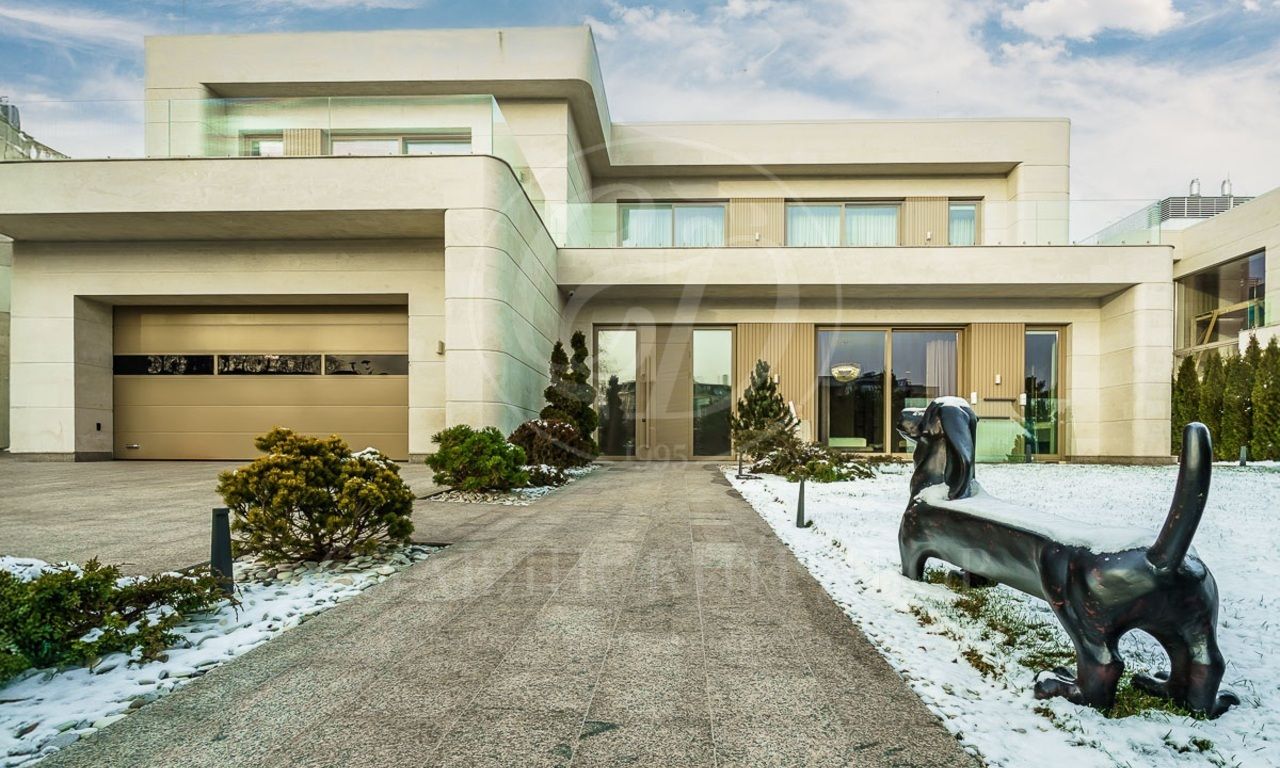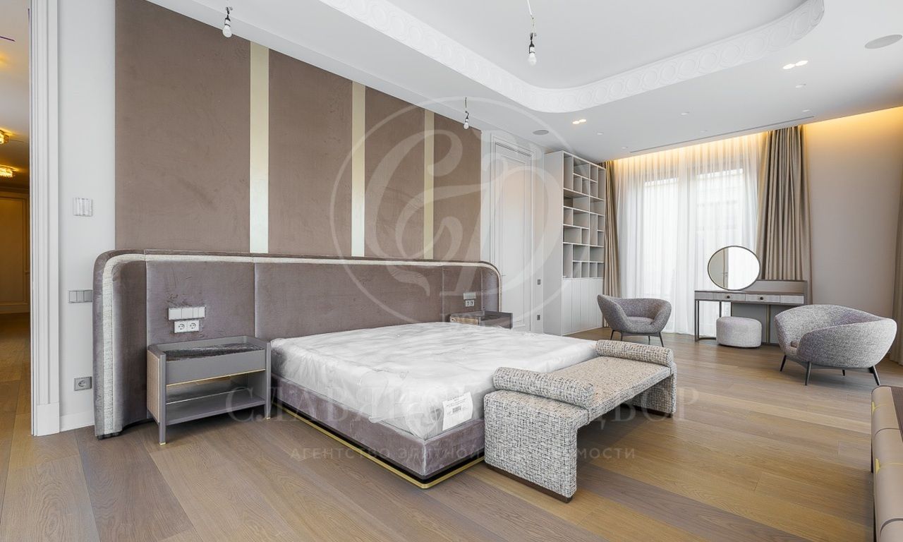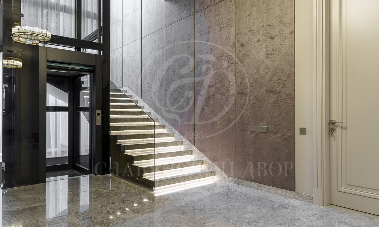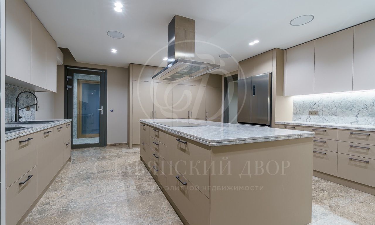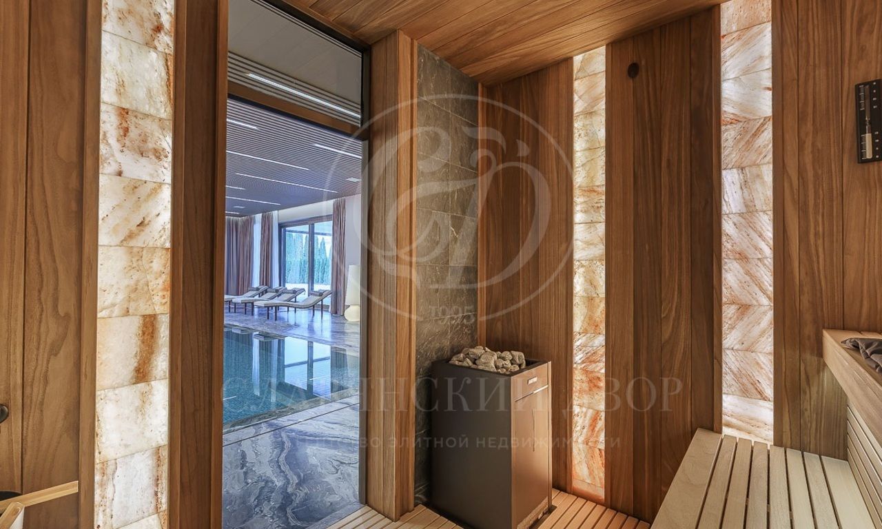 Первый этаж: холл, гостиная с камином, столовая, кухня, лифт, спальня с с/у и гардеробной, SPA-зона (бассейн, сауна, душевая), кабинет, 3 с/у, гардеробная, серверная, гараж на 2 м/м;