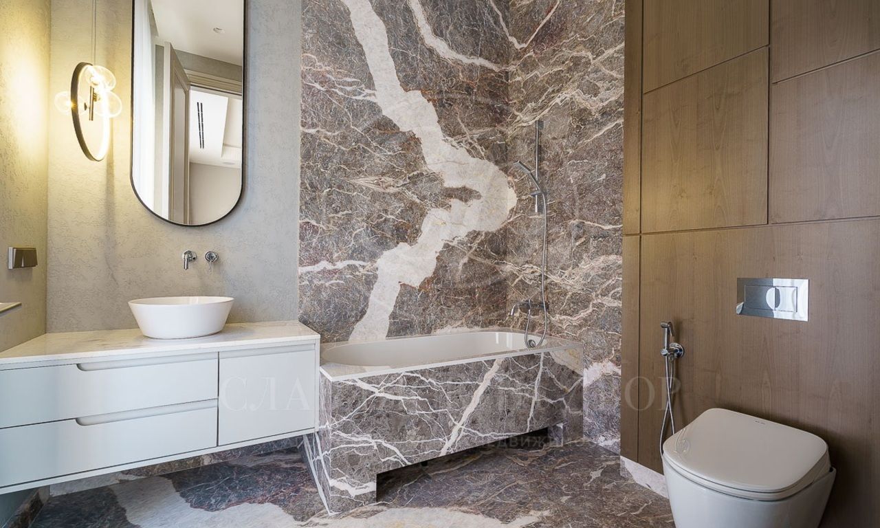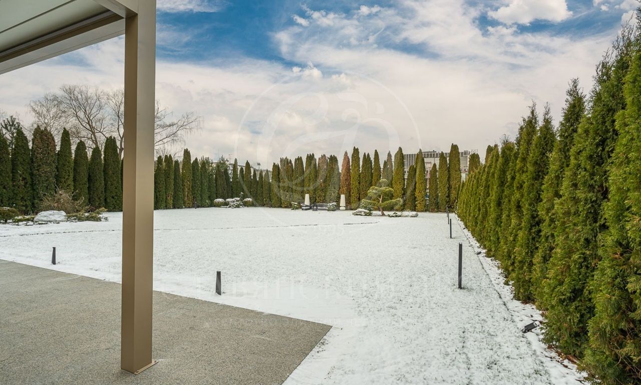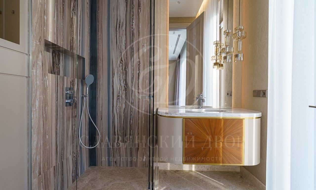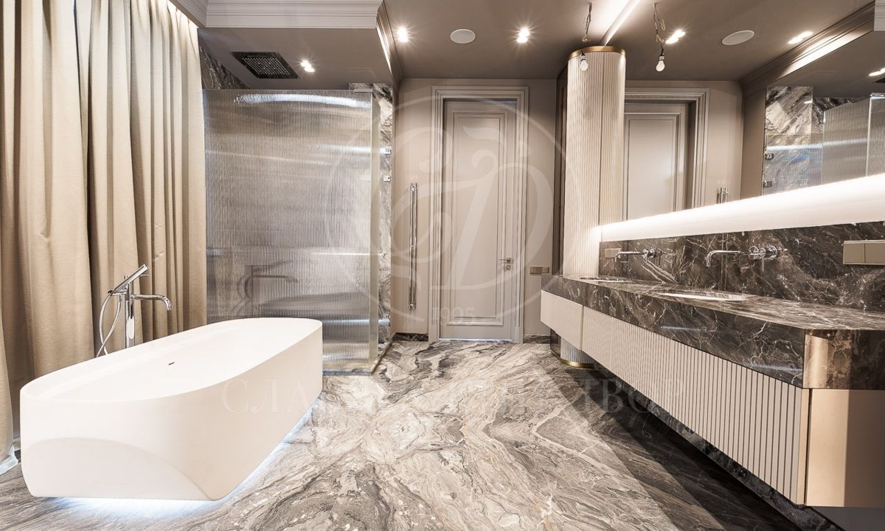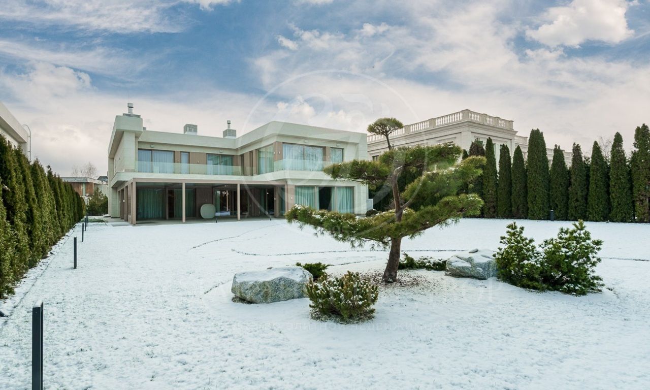 Первый этаж: холл, гостиная с камином, столовая, кухня, лифт, спальня с с/у и гардеробной, SPA-зона (бассейн, сауна, душевая), кабинет, 3 с/у, гардеробная, серверная, гараж на 2 м/м;