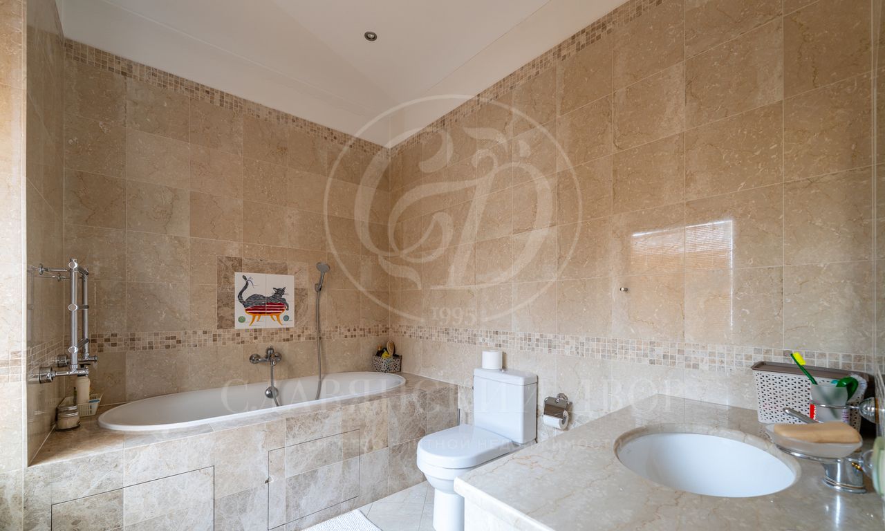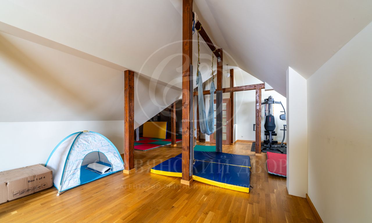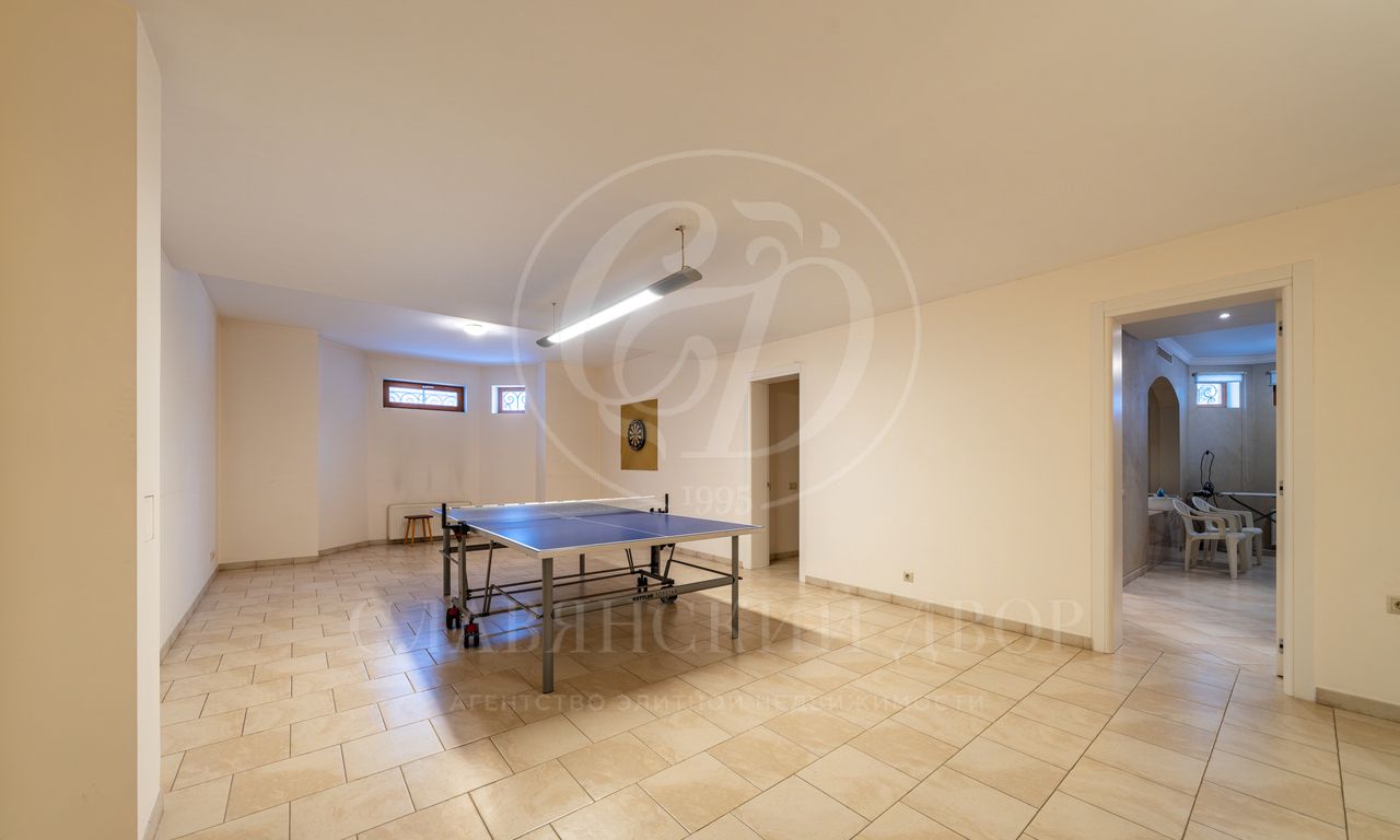 Планировка дома продумана для мелочей: просторная гостиная с камином, пять спален (в тч. спальня на первом этаже), большая воркаут зона для спорта и йоги, сауна, отдельная комната для персонала, гараж на 2 м/м + большой навес.