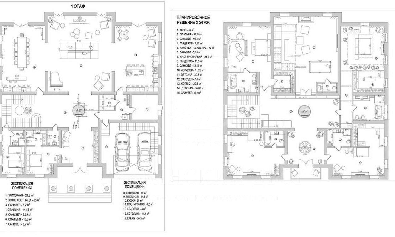 2 этаж: мастер-блок с гардеробной и большой ванной комнатой; вторая спальня с гардеробной и ванной комнатой; 2 детских с ванными комнатами и гардеробными; большая гостиная/домашний кинотеатр, санузел
