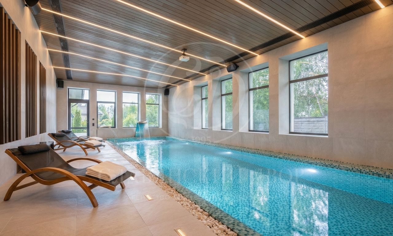 Для вдохновения и отдыха предназначены уютная гостиная с камином, открытая веранда и пять спален, для работы — уединённый кабинет, а для расслабления — роскошная спа-зона с сауной и бассейном 3,5х15 метров.