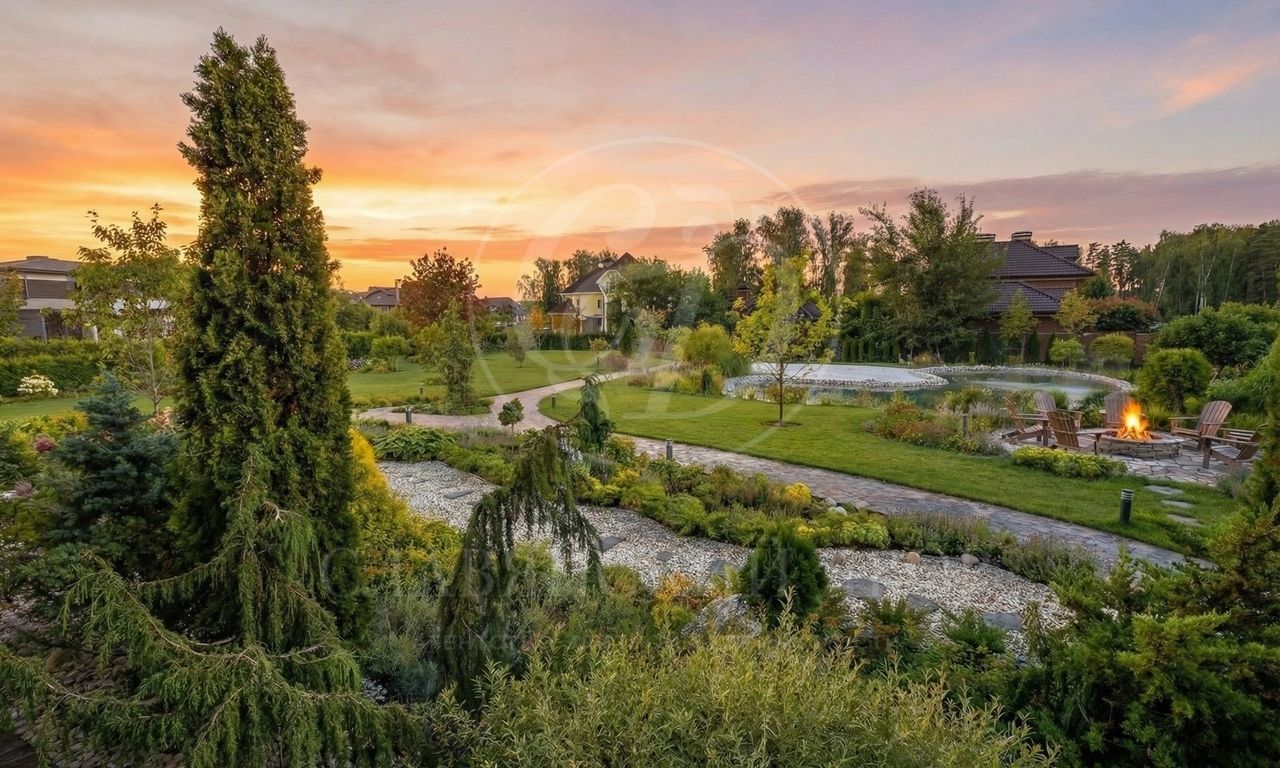 На участке выполнен ландшафтный дизайн — здесь можно вдыхать аромат свежескошенной травы, наслаждаться отдыхом у собственного пруда, прогуливаться по мощёным дорожкам в тени высоких деревьев и любоваться декоративными кустарниками, фруктовым садом и цветниками.