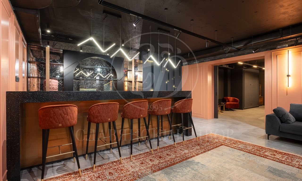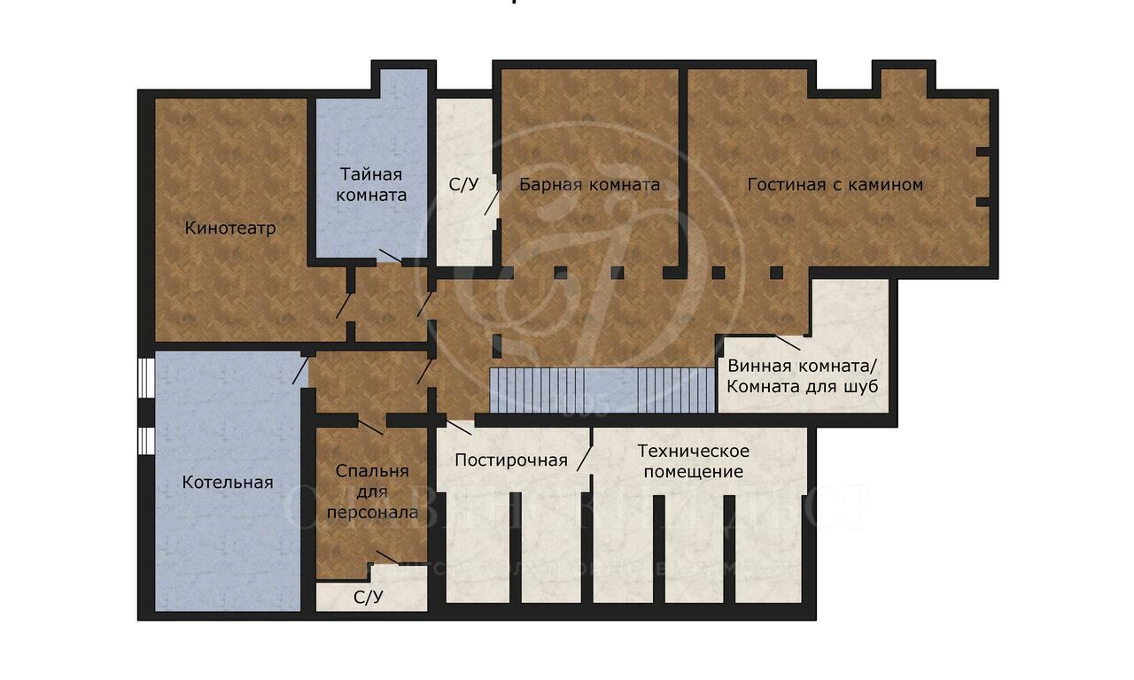 • Цокольный этаж: холл, винная комната, сигарная, тренажёрный зал с баром и санузлом,