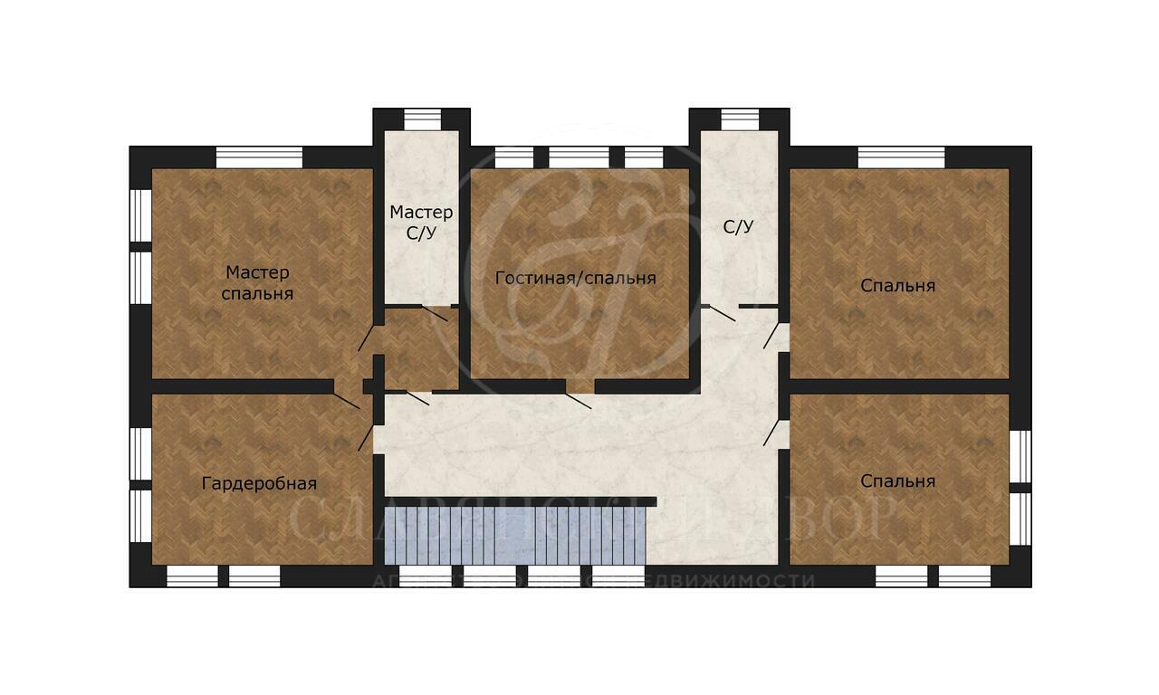 • 2 этаж: холл, мастер-спальня с гардеробной и санузлом, три спальни, санузел.