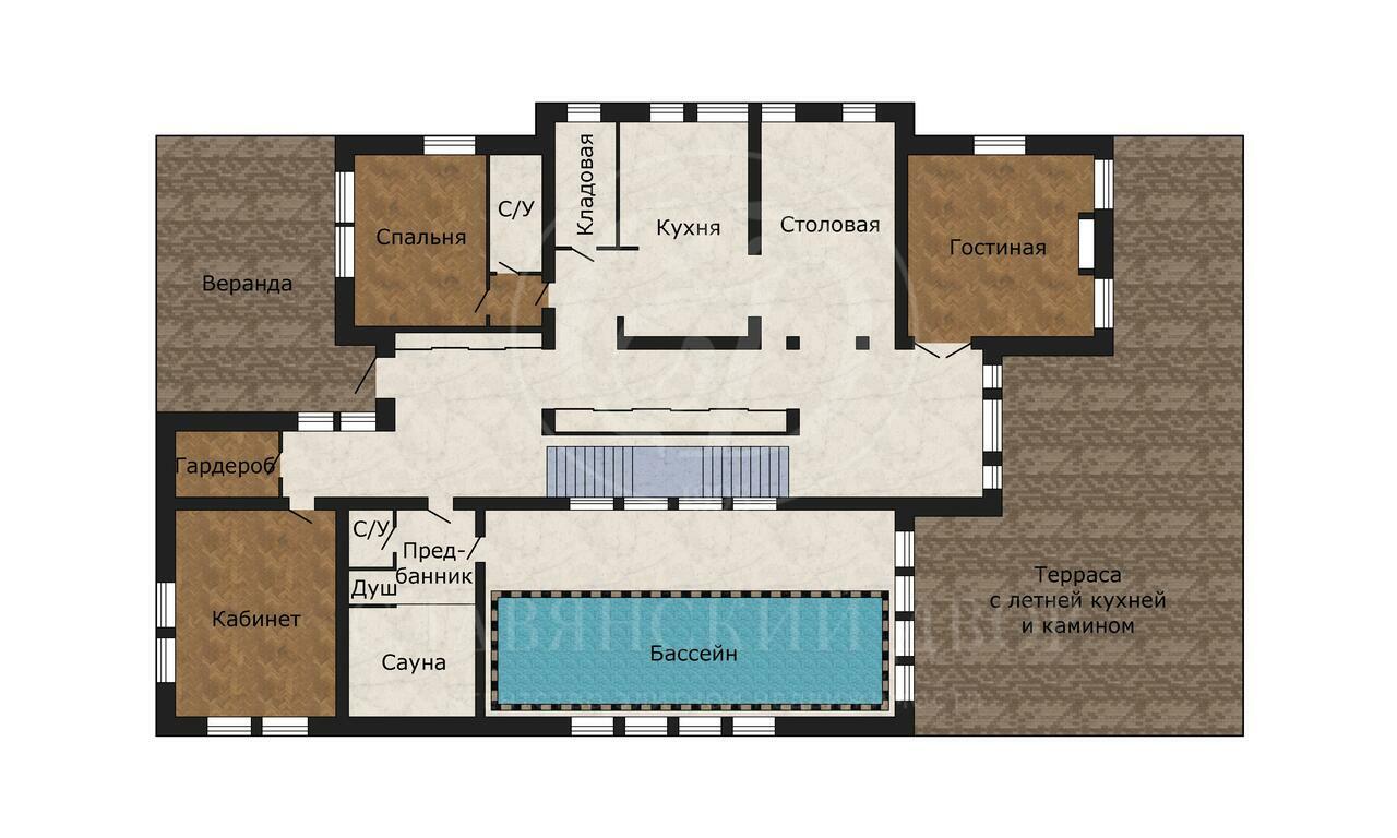 с санузлом, кабинет, гардеробная, спа-зона с бассейном, сауной и санузлом, веранда.