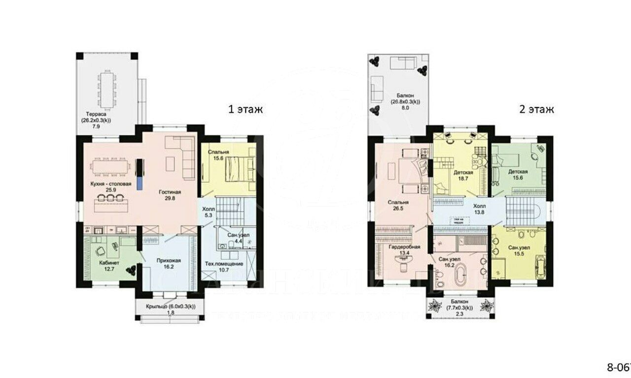 На втором этаже общей площадью 154.2 кв.м. расположилась большая спальня площадью 26,5 кв.м с собственной гардеробной и ванной комнатой, 2 детских с санузлом. Из мастер-спальни есть выход на крытую террасу