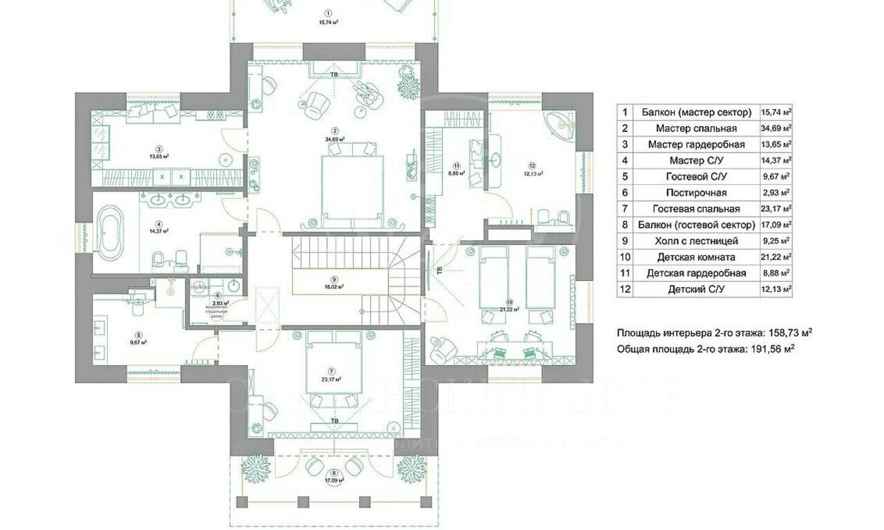 В доме 4 спальни с санузлами и гардеробными.