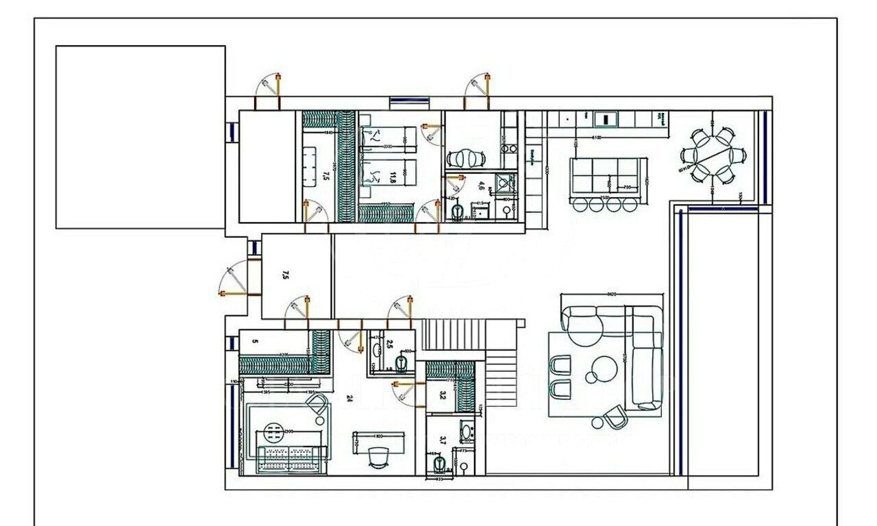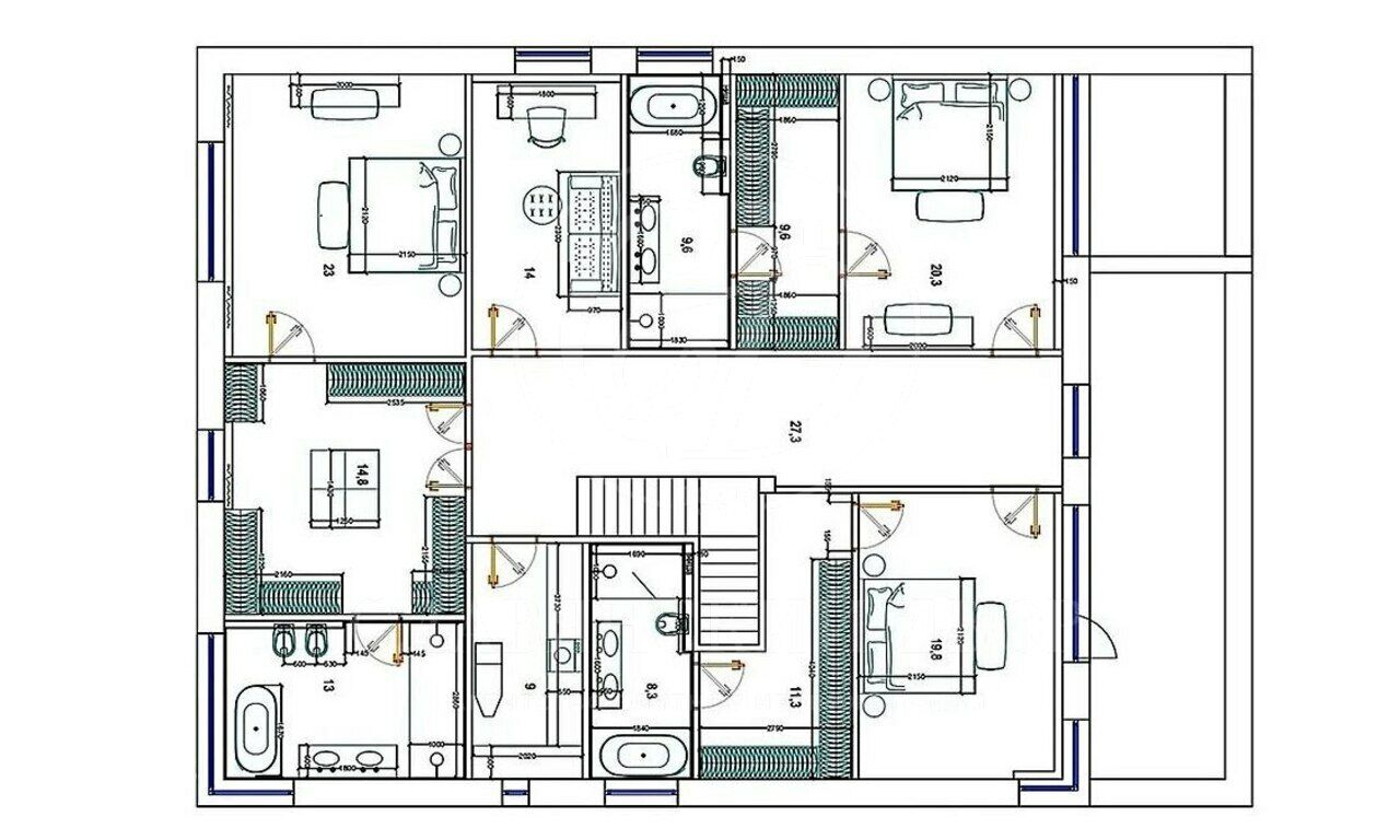 Помимо общих зон внутреннее пространство может вместить 4 спальни и 5 санузлов.
