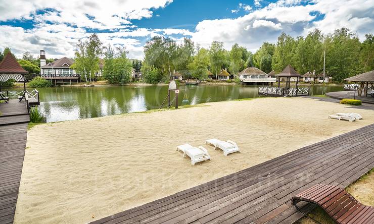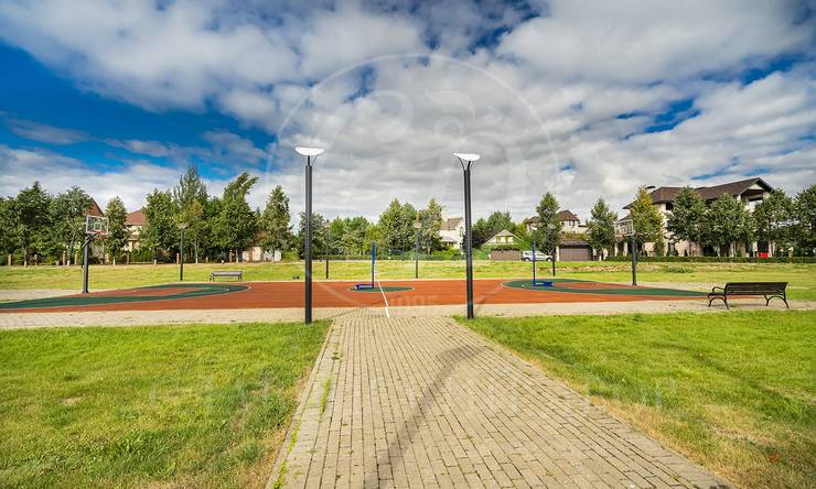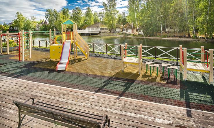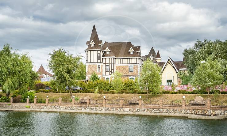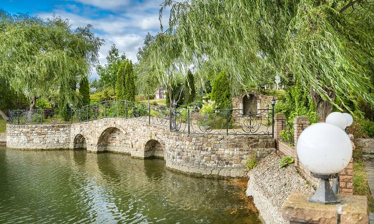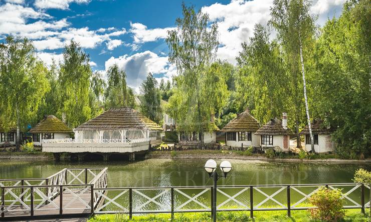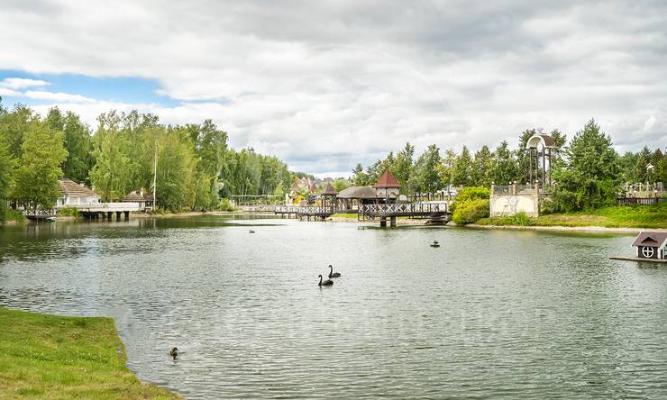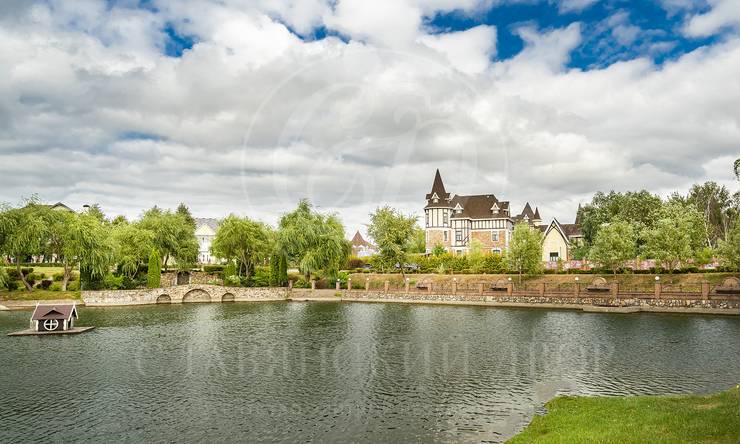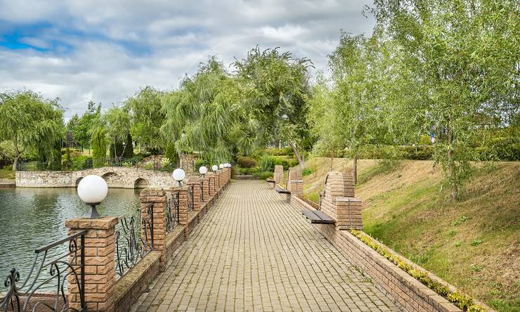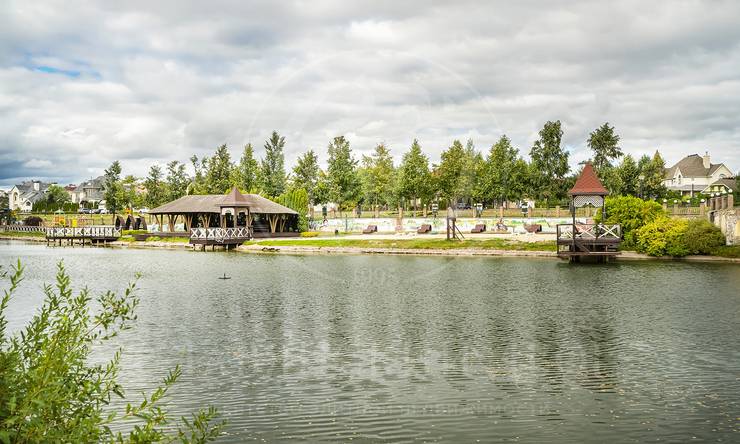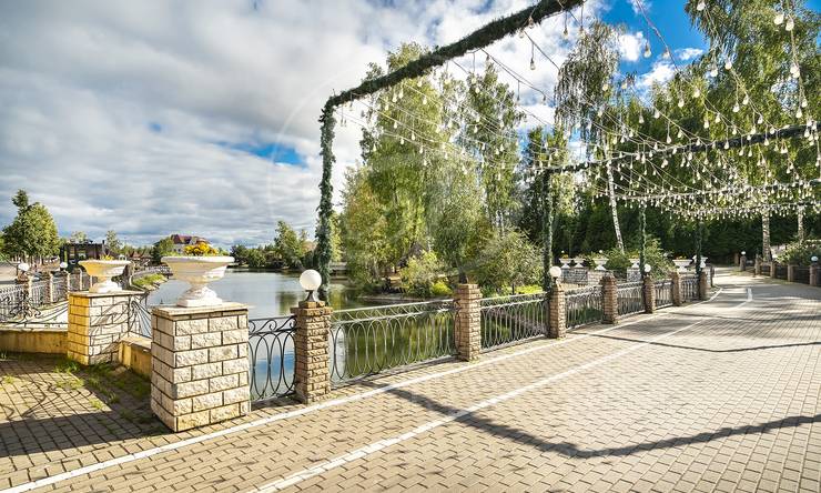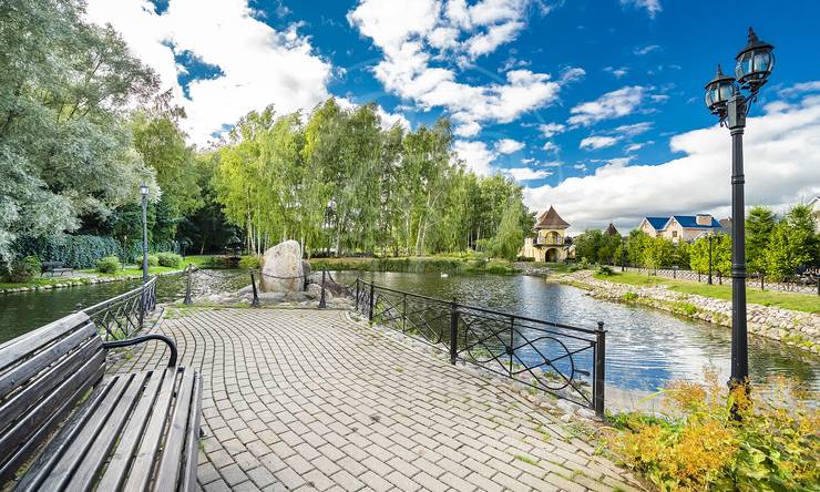 Через озёрные протоки переброшены живописные пешеходные мосты и стилизованные мельничные дамбы. Ландшафт и освещение тщательно продуманы для гармоничного сочетания с архитектурой поселка. Особое внимание уделено кованым резным ограждениям, которые придают территории изысканный вид.