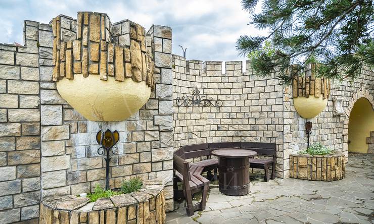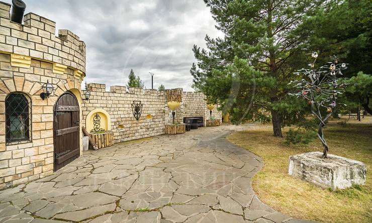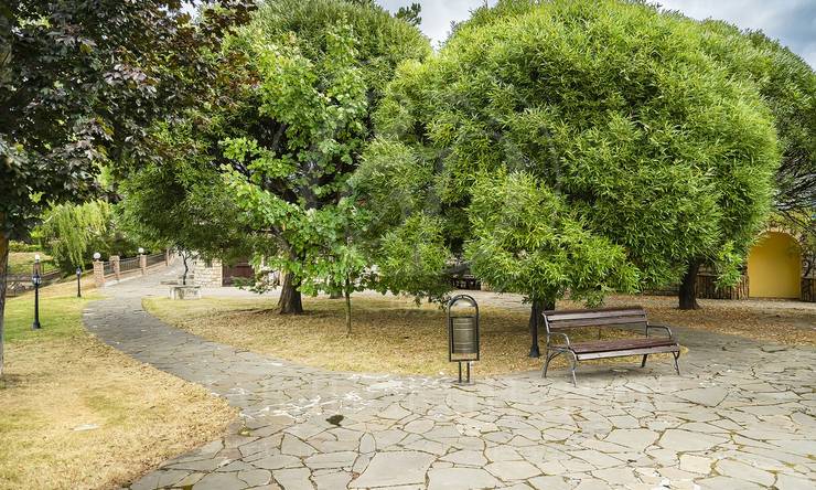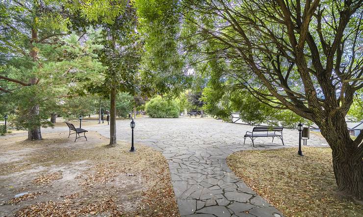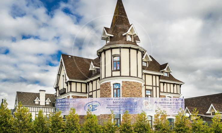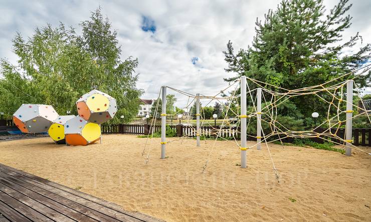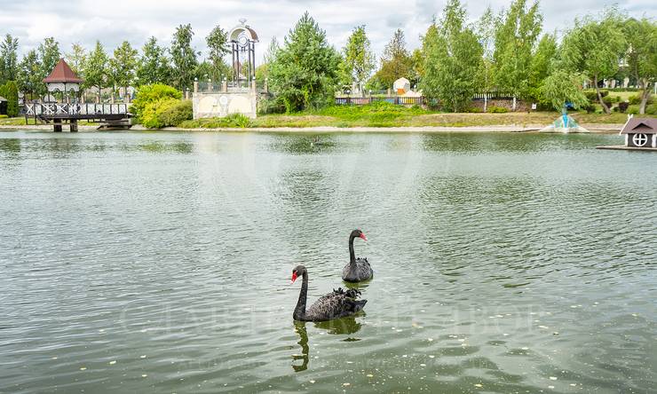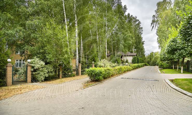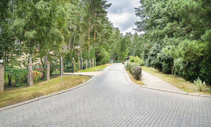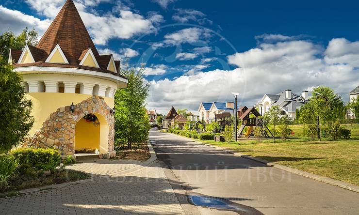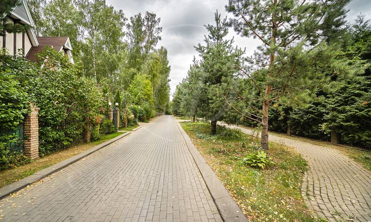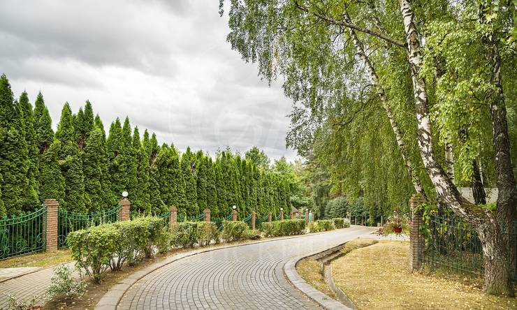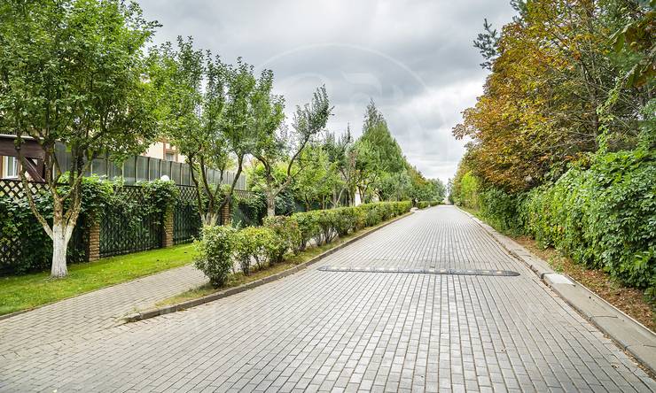 Через озёрные протоки переброшены живописные пешеходные мосты и стилизованные мельничные дамбы. Ландшафт и освещение тщательно продуманы для гармоничного сочетания с архитектурой поселка. Особое внимание уделено кованым резным ограждениям, которые придают территории изысканный вид.