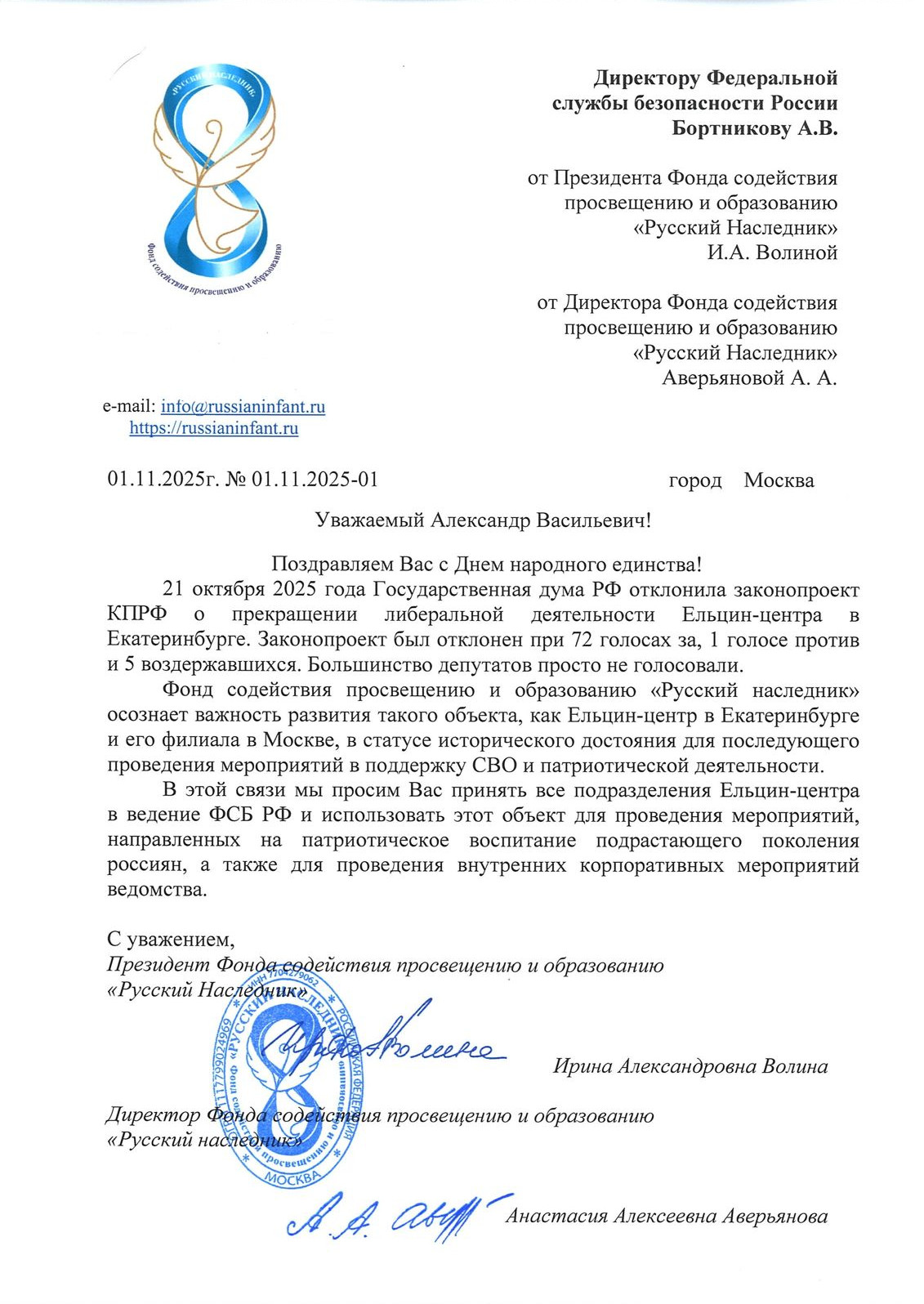 Сегодня мы хотим поделиться с вами новостью. Благодаря многочисленным обращениям в Фонд «Русский Наследник» о ситуации вокруг Ельцин Центра, которая тесно связана с деятельностью либералов и возмущает россиян, мы обратились к депутатам Государственной Думы и руководству Федеральной службы безопасности Российской Федерации с предложением о передаче зданий Ельцин Центра в ведение ФСБ для проведения в нем мероприятий, направленных на патриотическое воспитание подрастающего поколения россиян, и проведения внутренних корпоративных мероприятий ведомства.