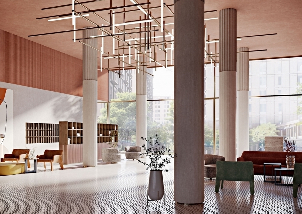 Лобби, по проекту, просторные и хорошо освещенные: панорамные окна идут в два ряда. Площадь от 252 до 262 м2, из них предусмотрены выходы во внутренний двор. У стоек ресепшен будут располагаться зоны отдыха, рядом — гостевые уборные. В отделке использованы натуральные материалы: керамическая плитка ручной работы, американский орех и другие ценные породы дерева. Отдельные элементы выполнены из латуни. Доминирующие цвета: песочный, изумрудный, терракотовый.