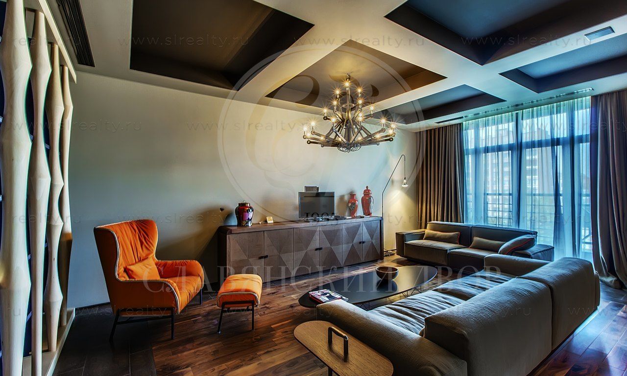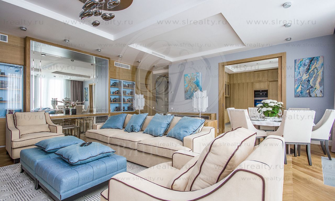 Гостиная + две спальни + комната свободного назначения. Две ванные комнаты. Гардеробная комната.